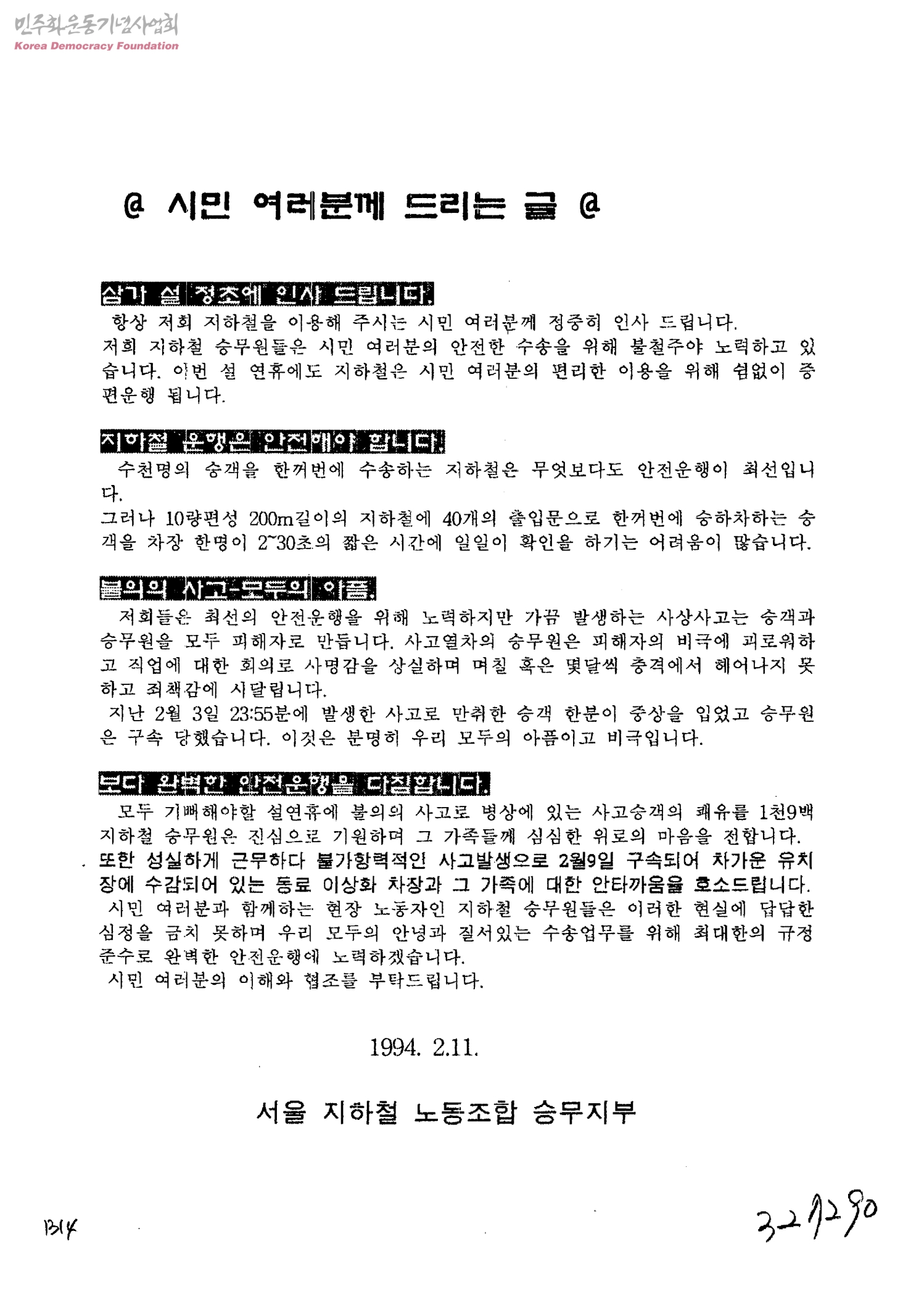 시민 여러분께 드리는 글[불가항력적인 사고로 인해 구속된 이상화 차장에 대해 안타까움으로 호소드립니다]