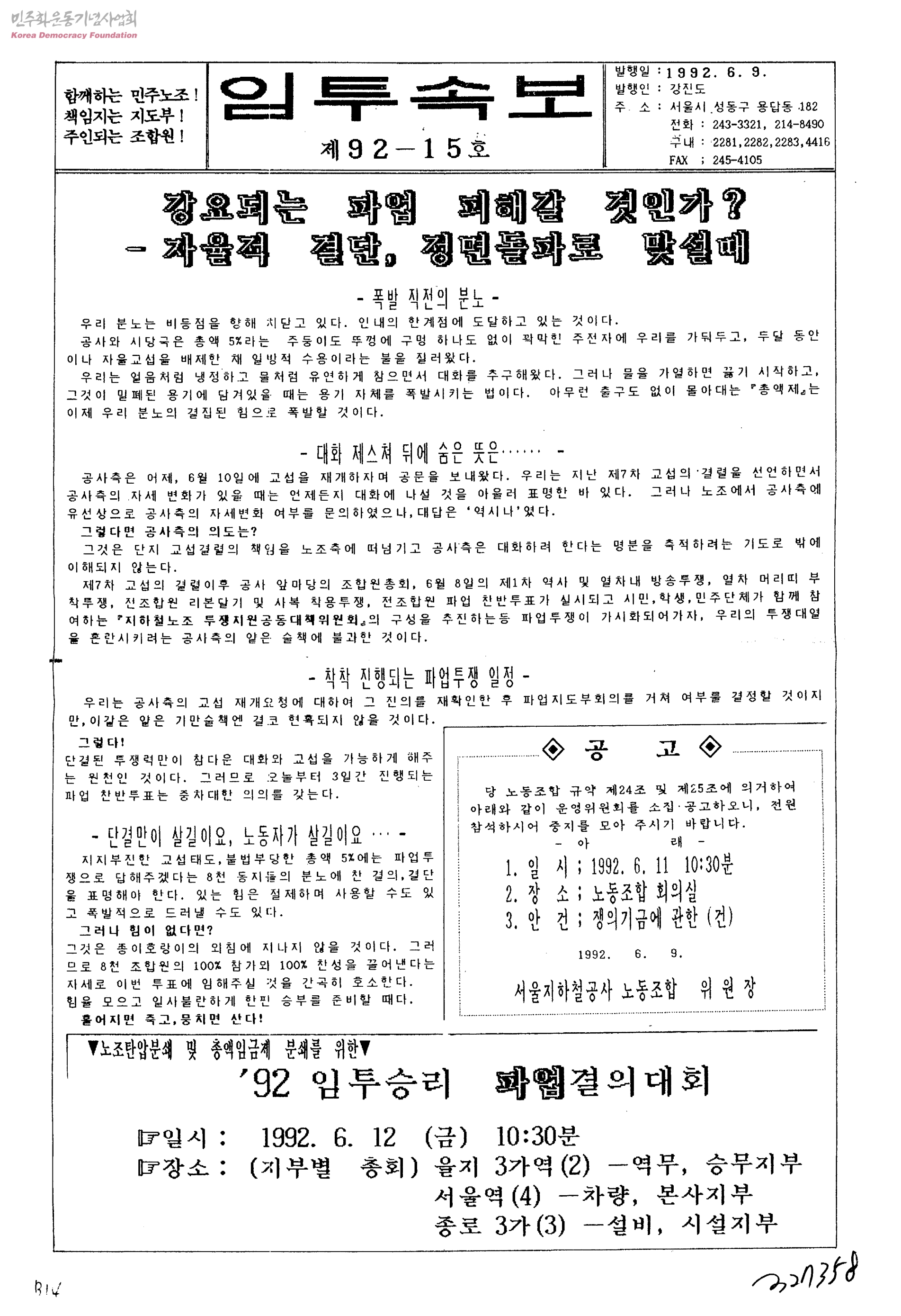 임투속보 제92-15호-강요되는 파업 피해갈 것인가? 자율적 결단, 정면돌파로 맞설때