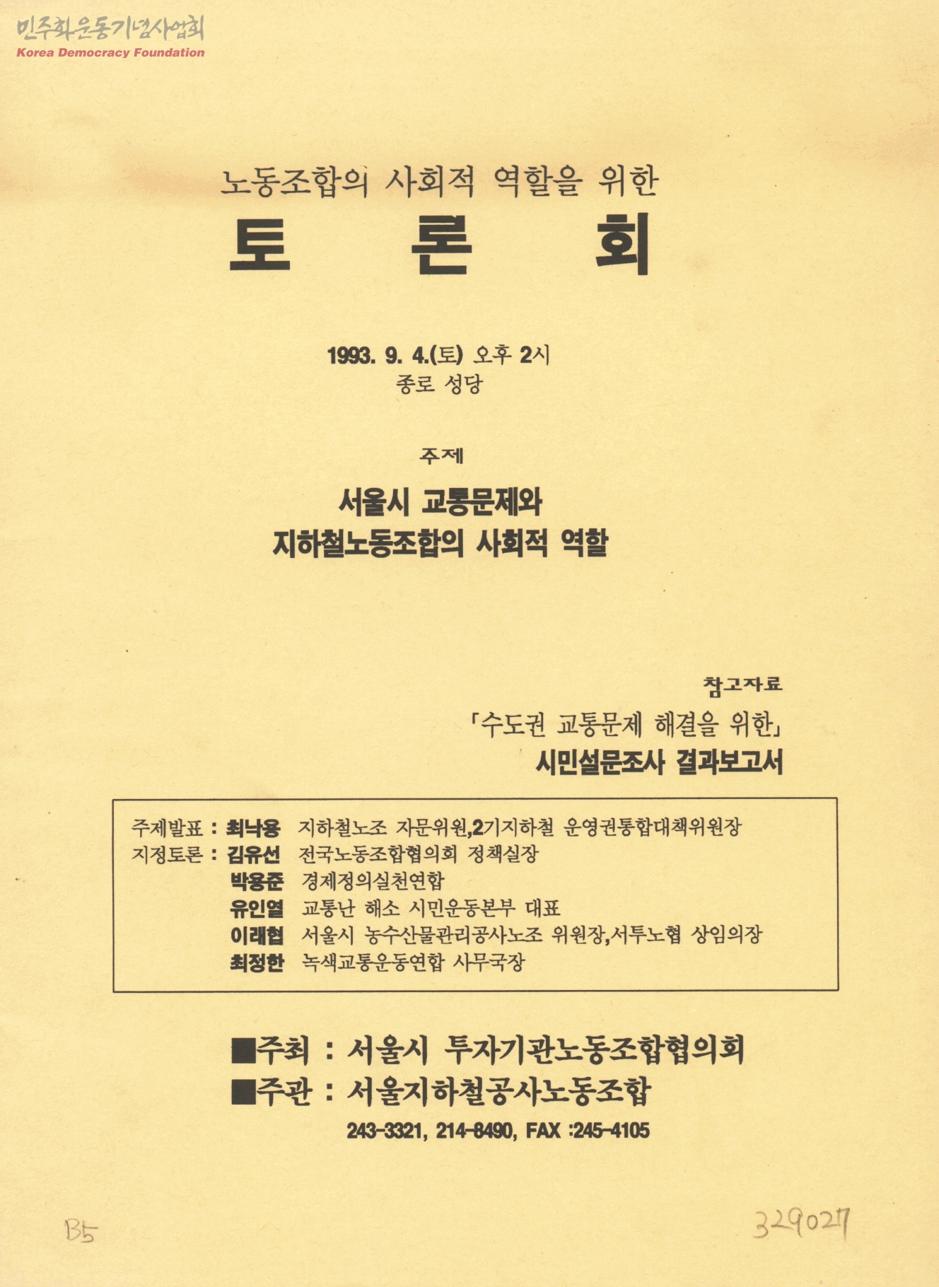 노동조합의 사회적 역할을 위한 토론회- 주제; 서울시 교통문제와 지하철노동조합의 사회적 역할