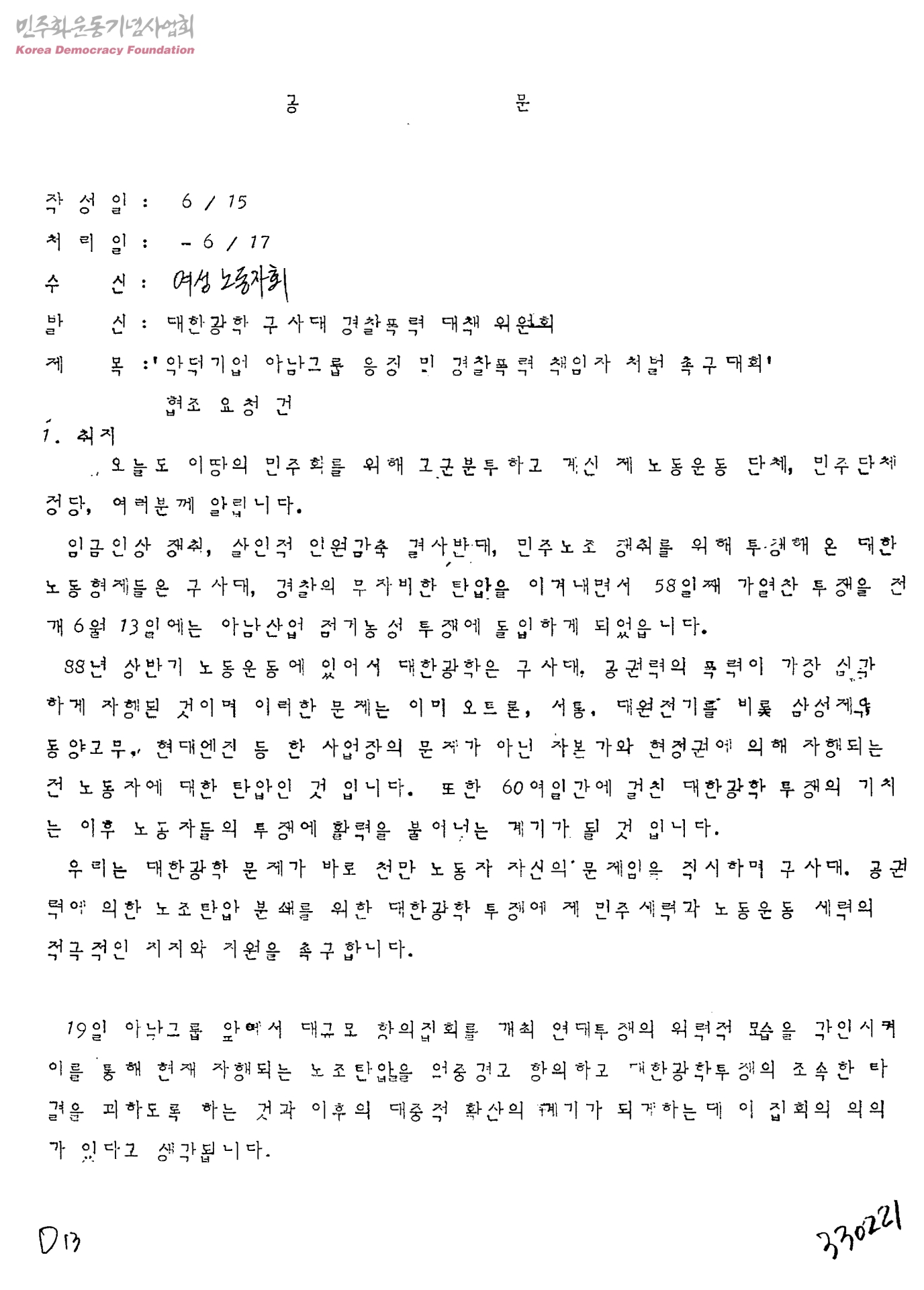 공문-'악덕기업 아남그룹 응징 및 경찰폭력책임자 처벌 촉구대회'협조요청의 건[수신:여성노동자회, 발신:대한광학구사대경찰폭력대책위원회]