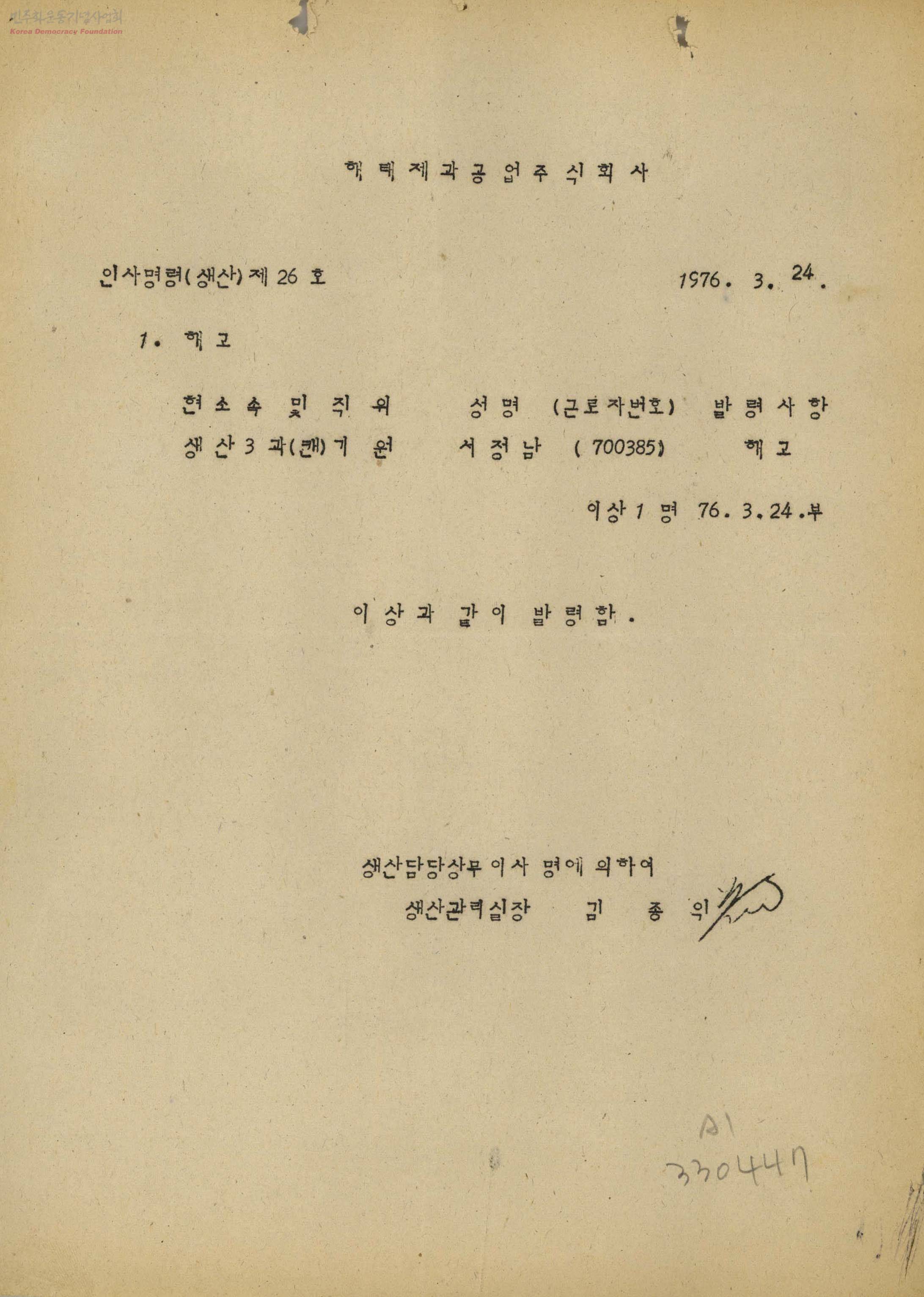 - *70년대 박정희 군사 독재정권의 노동운동 말살정책으로 인해 초과근무, 주중무휴의 악조건 속에서도 노동자들이 제대로된 권리을 찾지 못하던 중 벌어진 해태제과 노동자들의 8시간 노동제 쟁취투쟁 관련 문서. 서정남씨 해고 인사명령