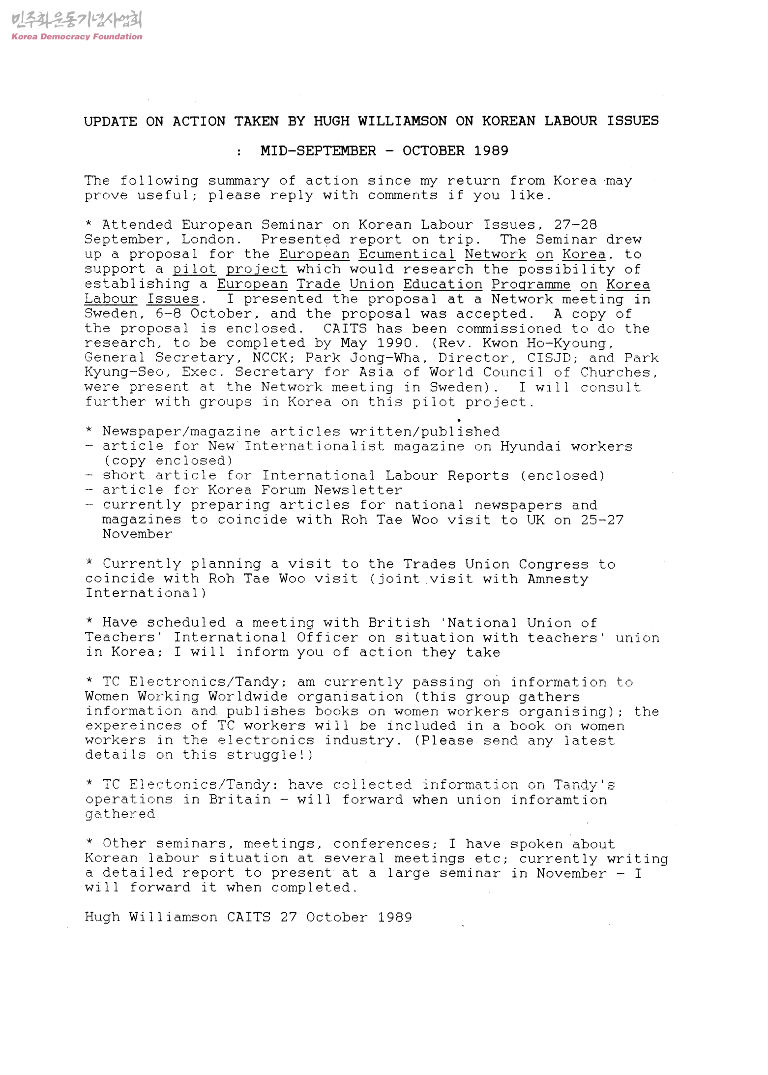 Update on Action Taken by Hugh Williamson on Korean Labour Issues: MID-September-October 1989