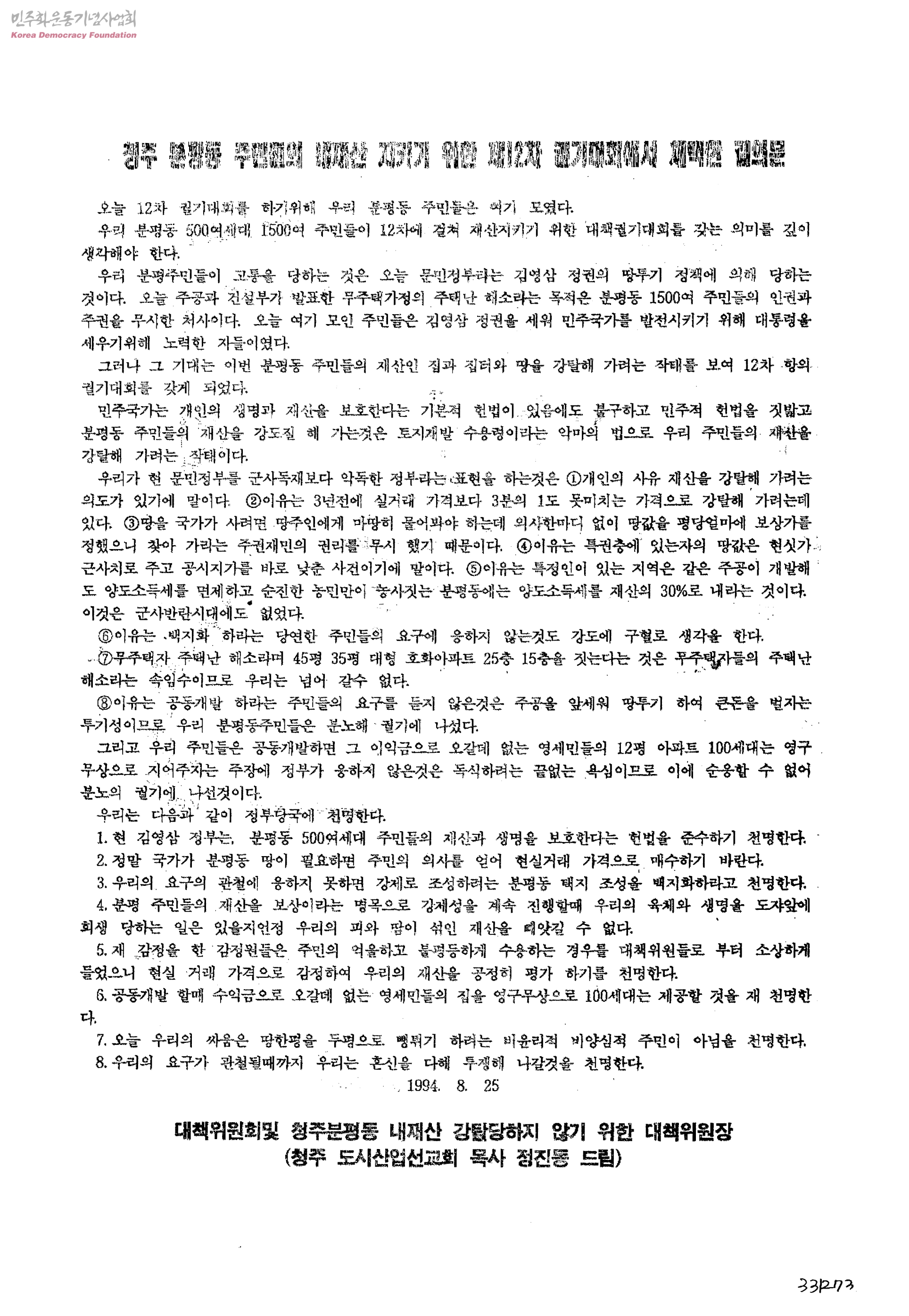 청주 분평동 주민들의 내재산 지키기 위한 제12차 궐기대회에서 채택한 결의문