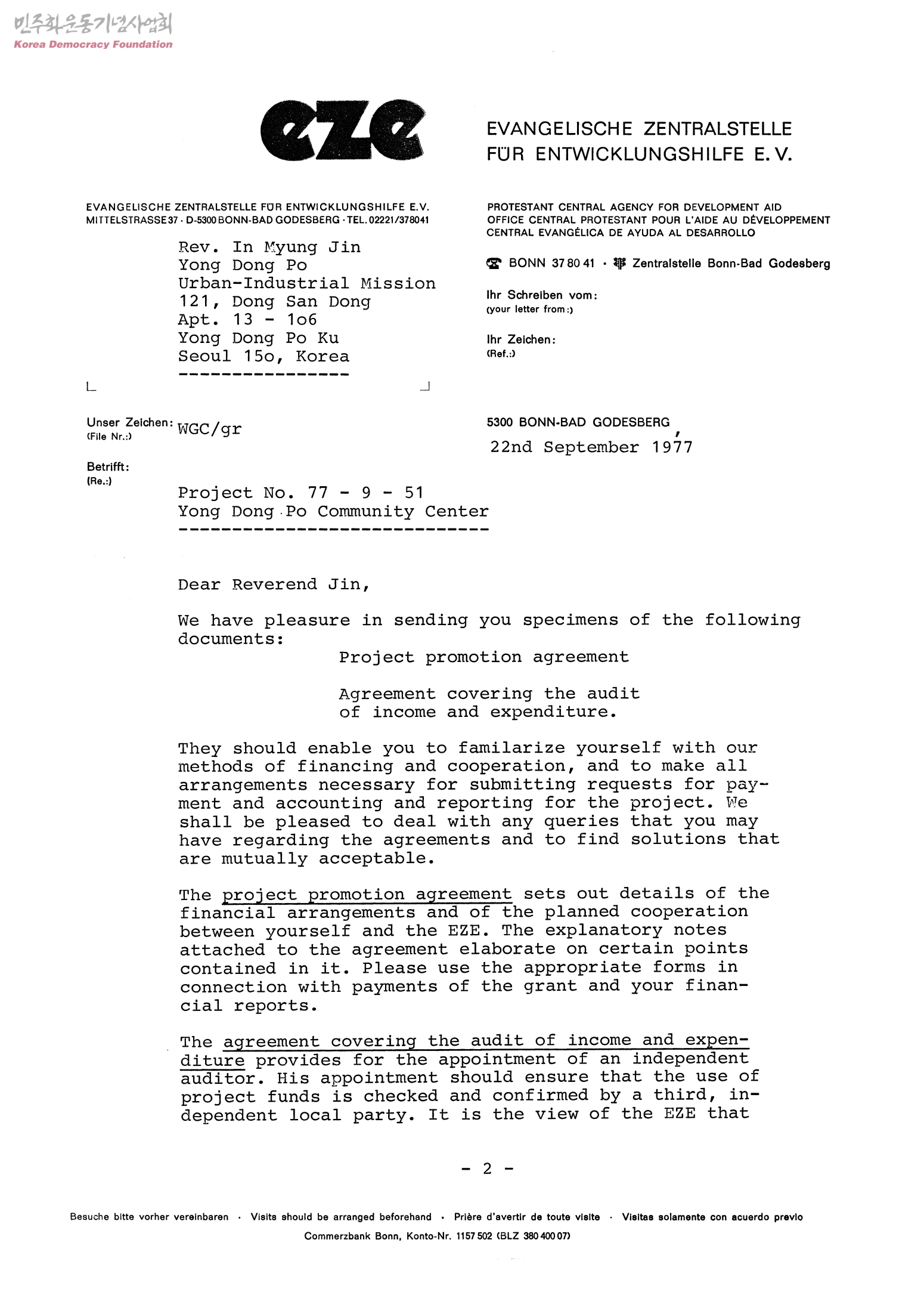 - Sending you specimens of the documents : Project promotion agreement, Agreement covering the audit of income and expenditure