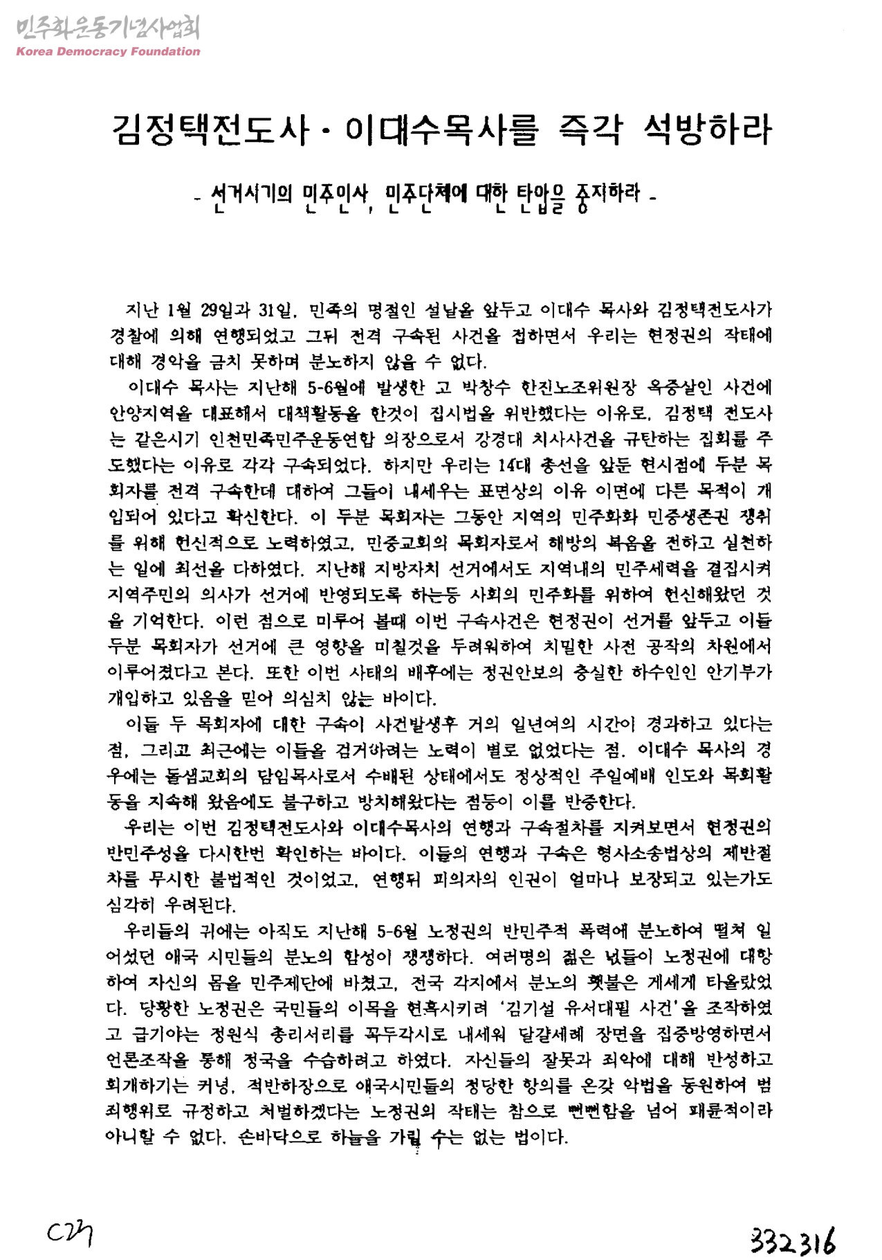 김정택전도사·이대수목사를 즉각 석방하라-선거시기 민주민사, 민주단체에 대한 탄압을 중지하라