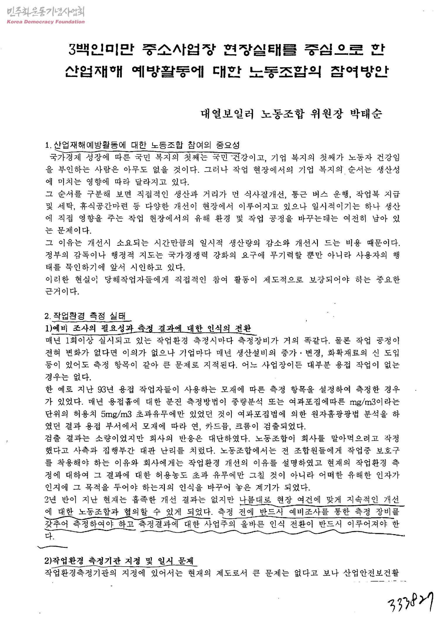 3백인미만 중소사업장 현장실태를 중심으로 한 산업재해 예방활동에 대한 노동조합의 참여방안