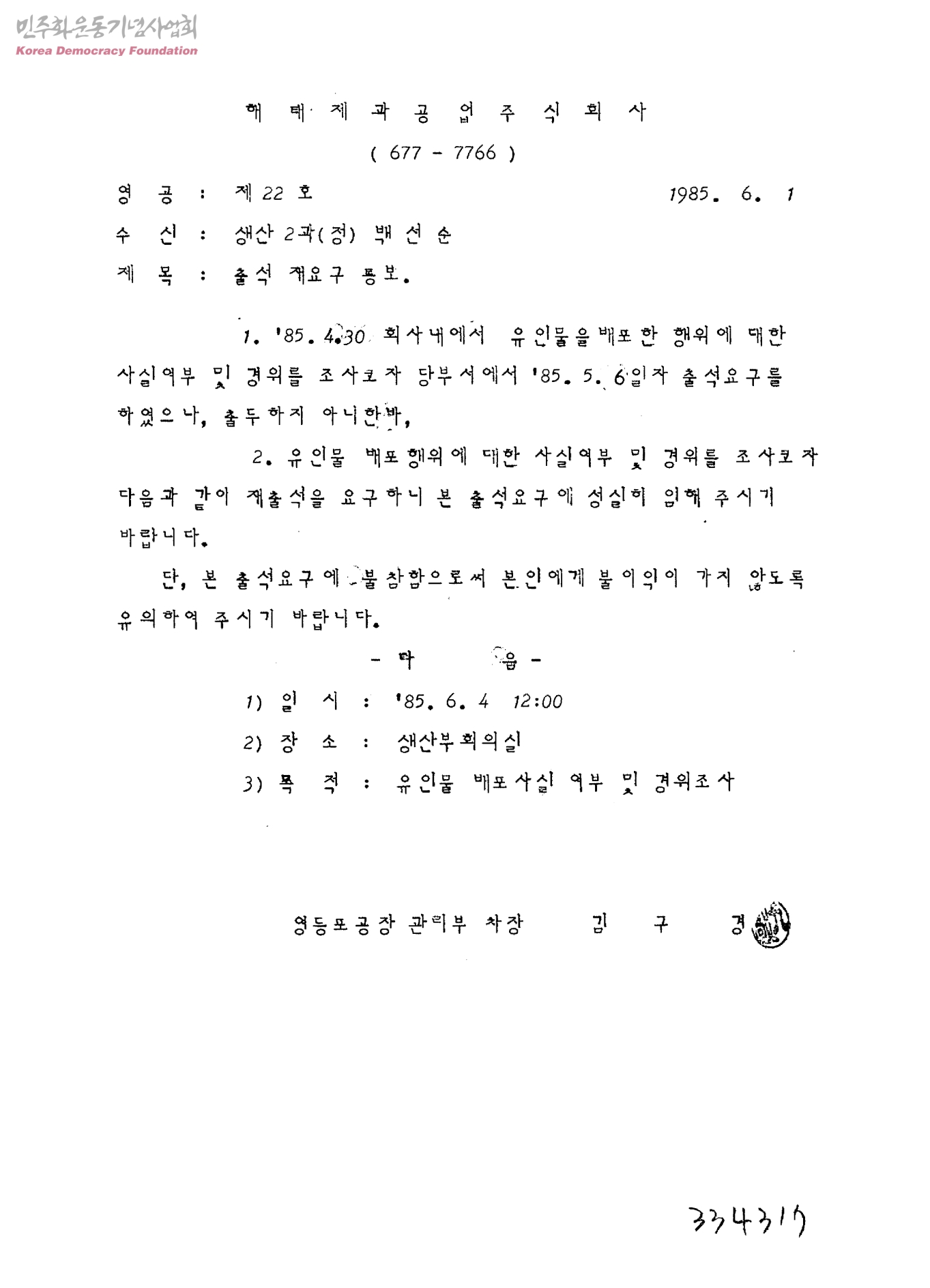 출석 재요구 통보[수신:백선순, 발신:해태제과공업주식회사 영등포공장관리부]