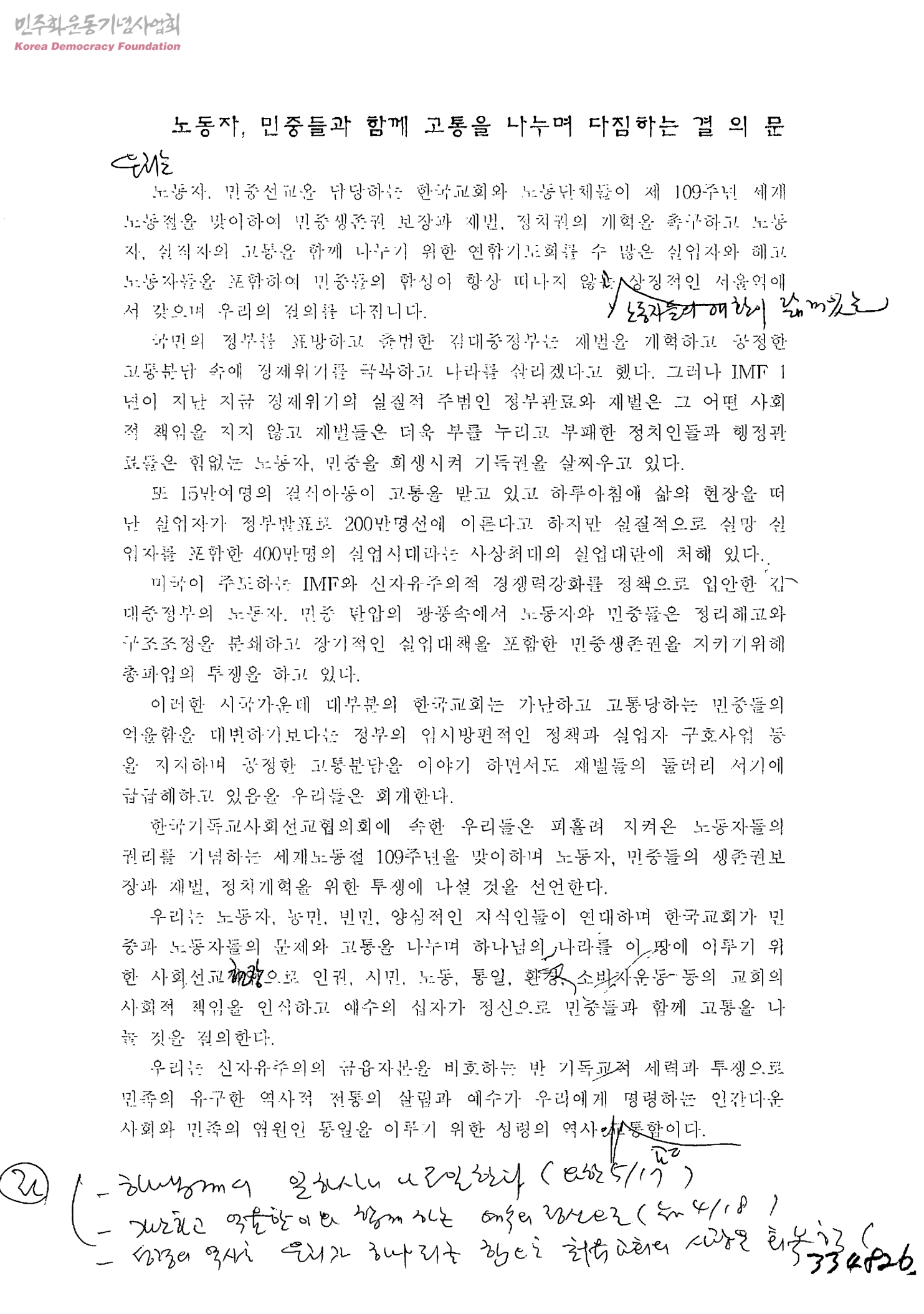 노동자, 민중들과 함께 고통을 나누며 다짐하는 결의문