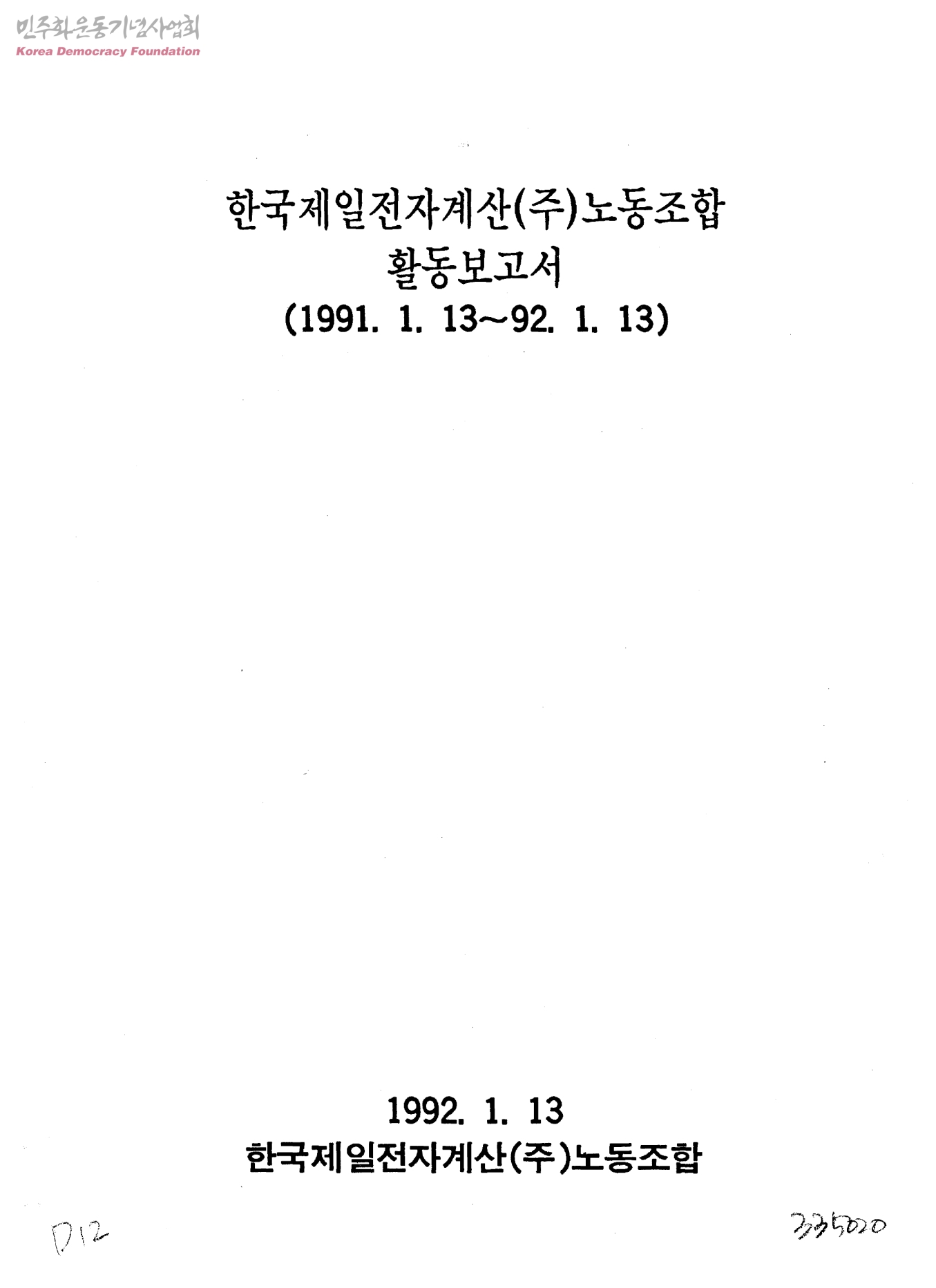 한국제일전자계산(주) 노동조합 활동보고서(1991.1.13~1992.1.13)