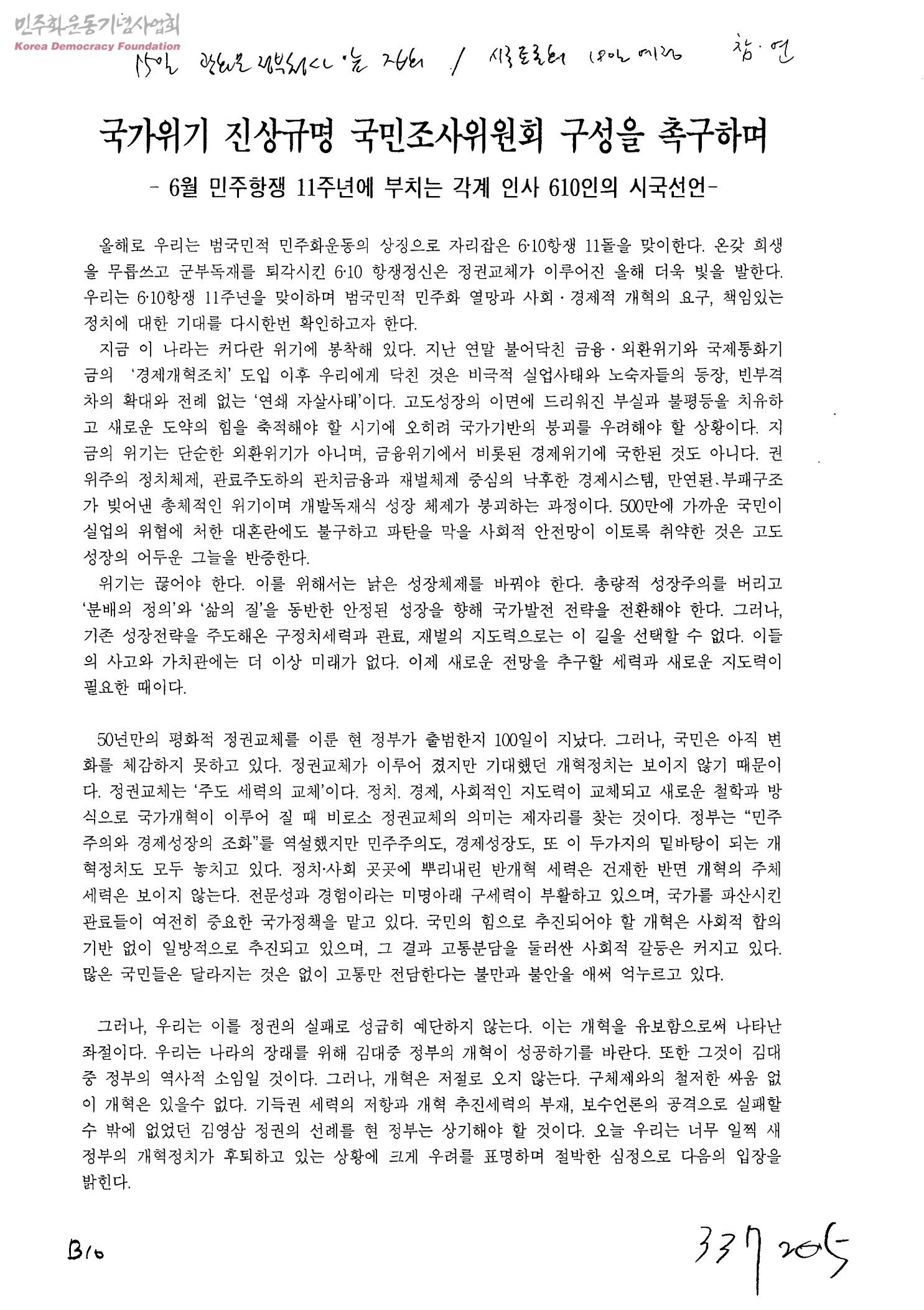 국가위기 진상규명 국민조사위원회 구성을 촉구하며-6월 민주항쟁 11주년에 부치는 각계 인사 610인의 시국선언
