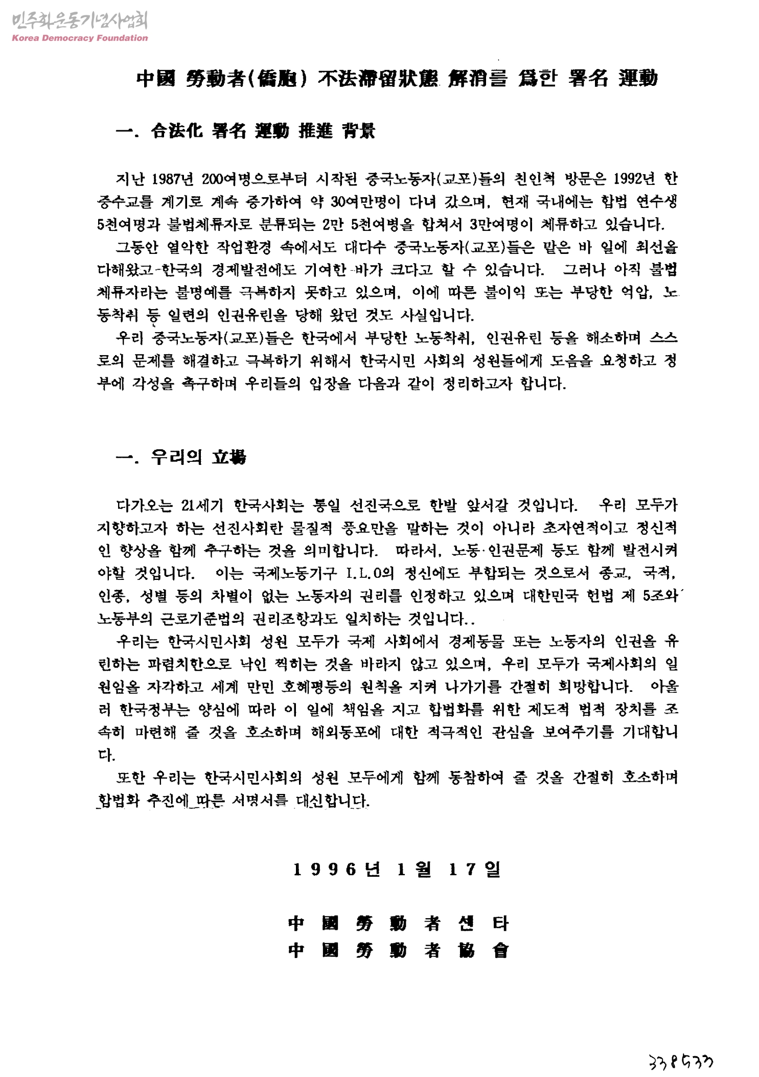 中國 勞動者(僑胞) 不法滯留狀態 解消를 爲한 署名 運動