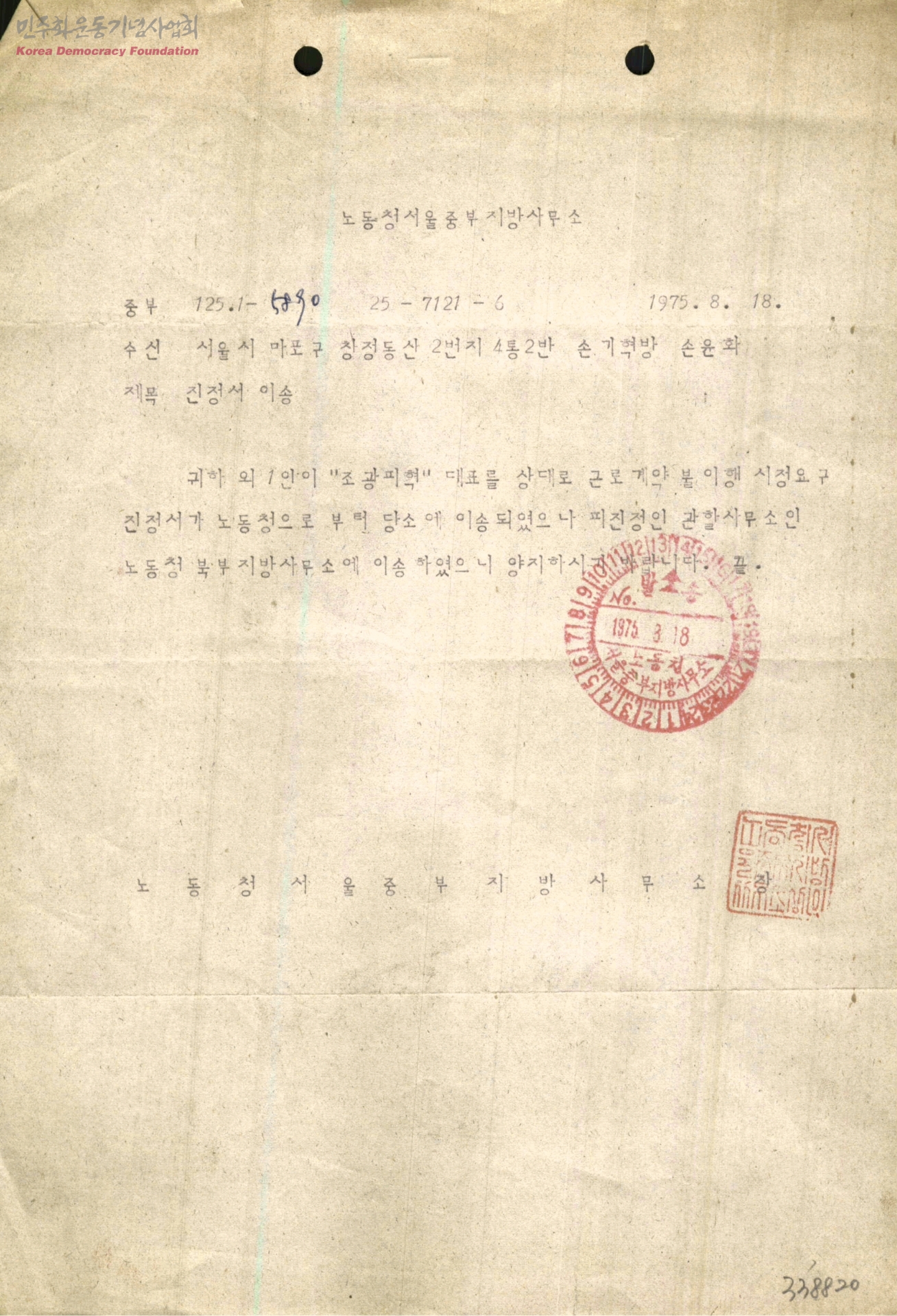 진정서 이송[수신:조광피혁주식회사 해고자 손윤화, 발신:노동청 서울 중보지방사무소장]