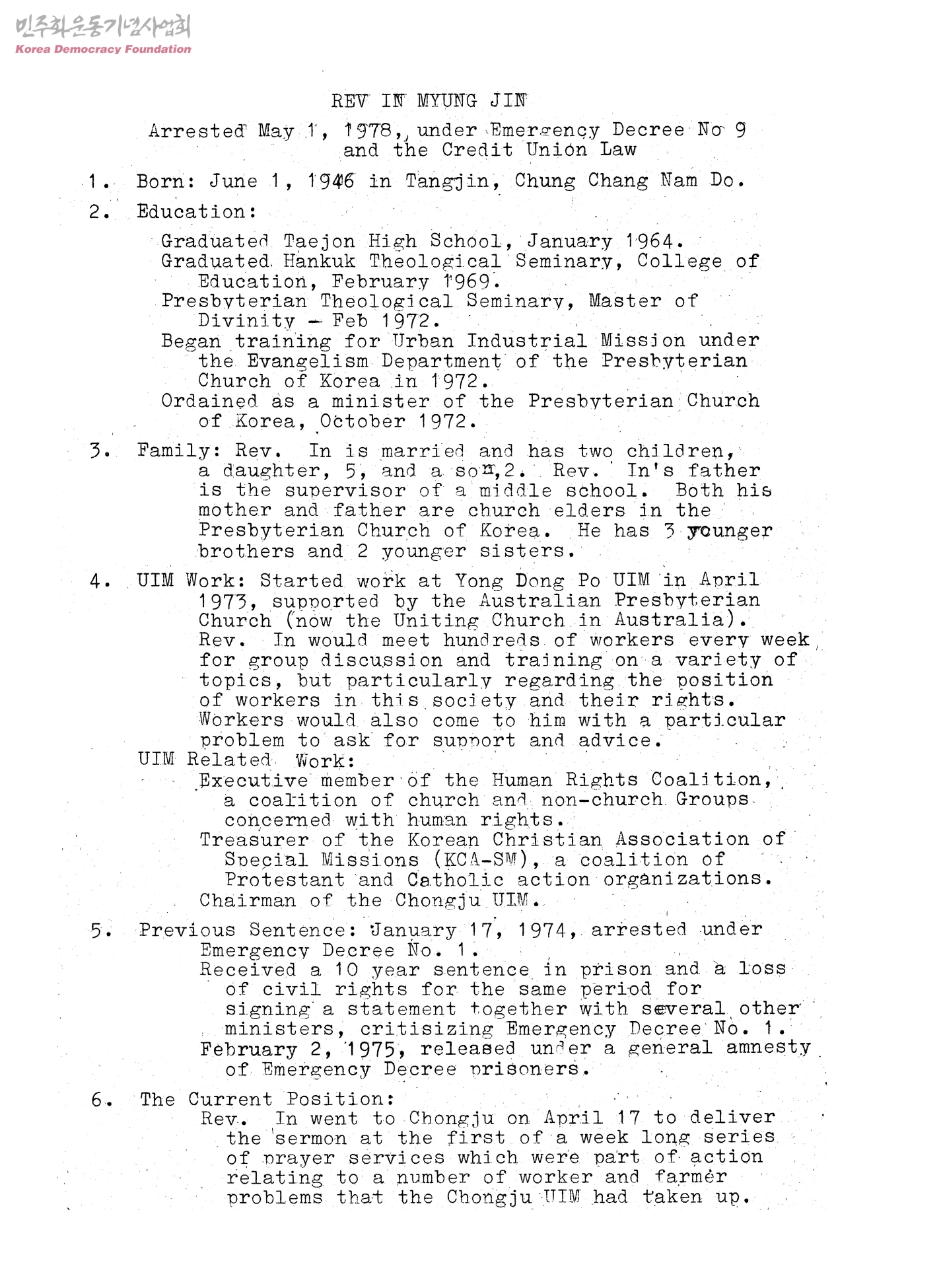 Rev IN MYUNG JIN-Arrested May 1,1978,under Emergency Decree No9 and the Credit Union Law