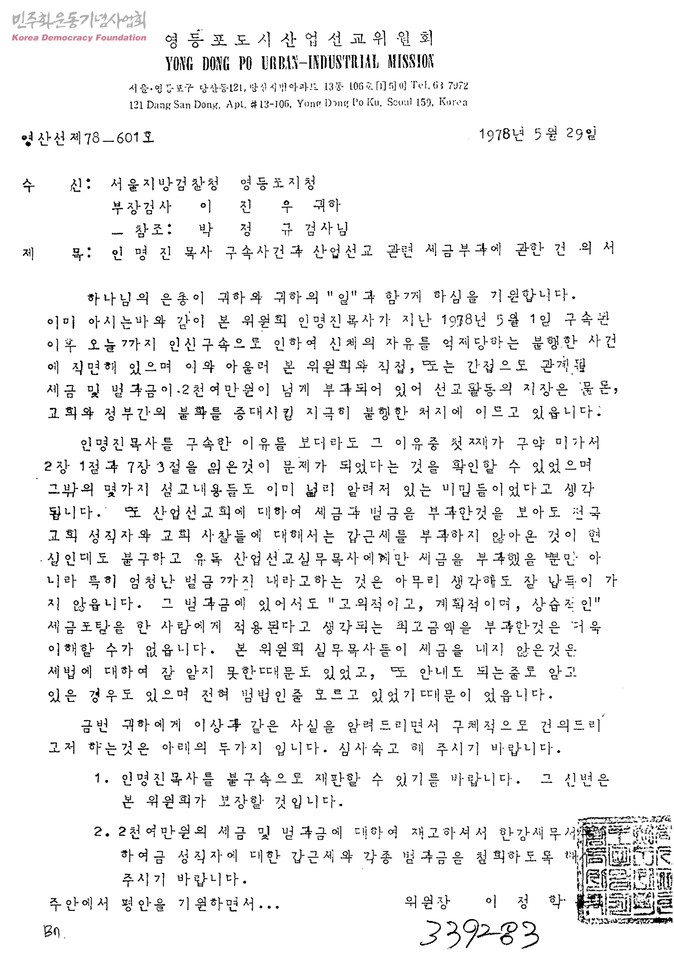 인명진목사 구속사건과 산업선교 관련 세금부과에 관한 건의서(수신; 서울지방검찰청 영등포지청 부장검사 이진우, 발신;영등포도시산업선교위원회)
