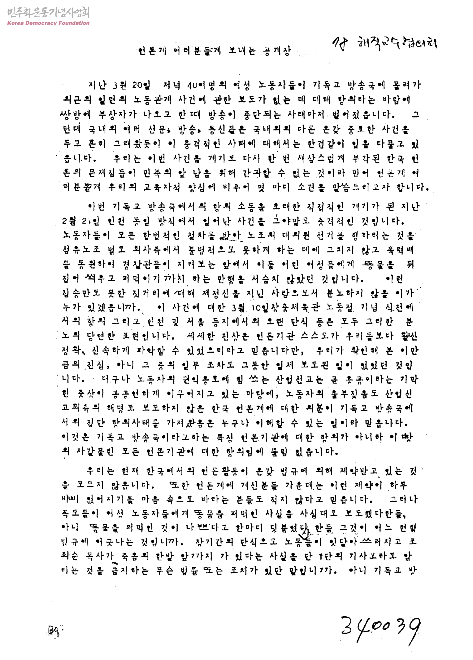 - 40여명의 여성노동자들이 기독교 방송국에 몰려가 최근의 일련의 노동관계 사건에 관한보도가 없는데 대해항의도중 쌍방가의 부상자가 많이 나오고 방송이 일시중지되는 사건에 대해 국내외방송,신문,언론들이 이사건에대해 묵인 한는것에대한 위단체소속원들의 소견문