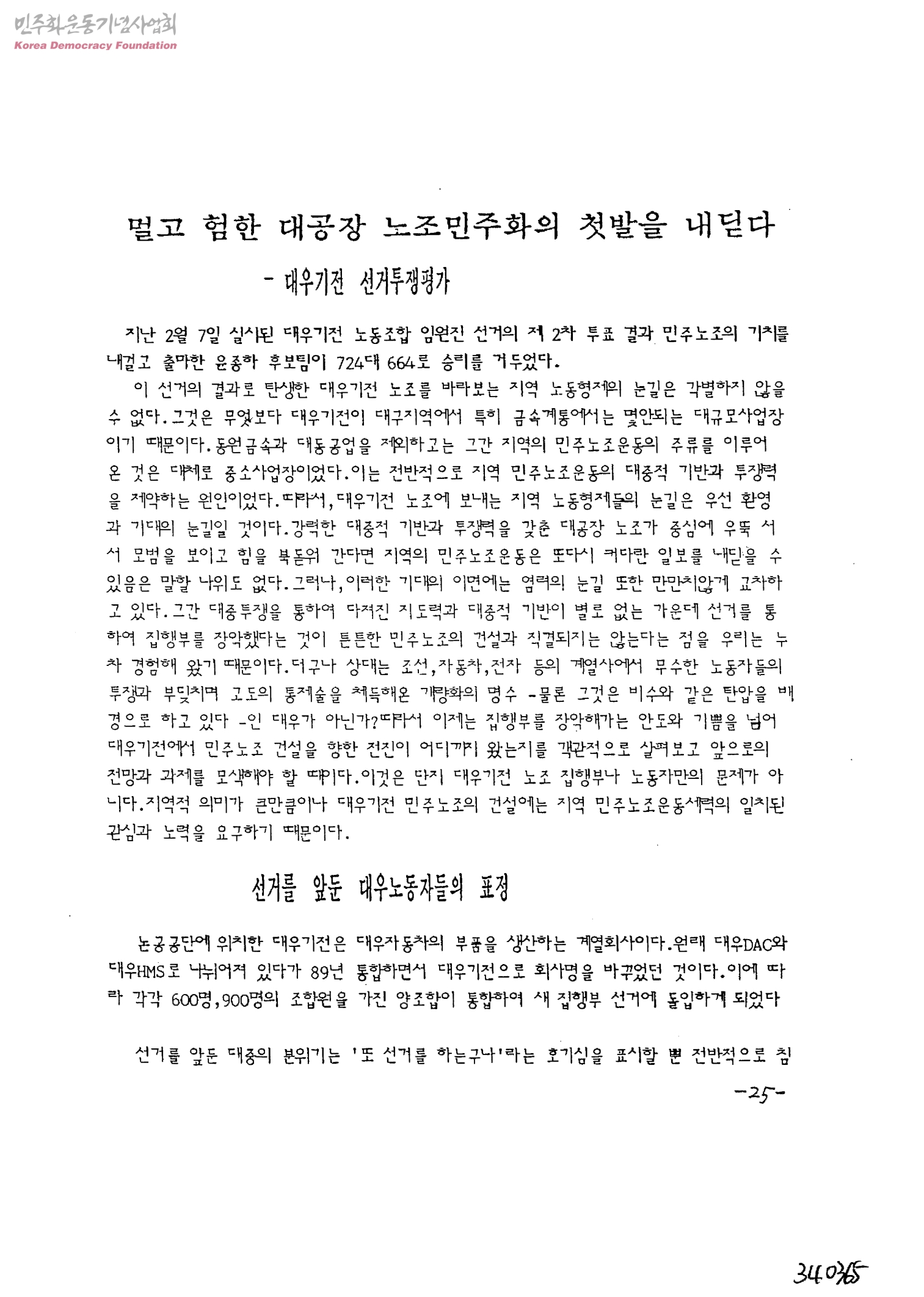 멀고 험한 대공장 노조민주화의 첫발을 내딛다-대우기전 선거투쟁평가