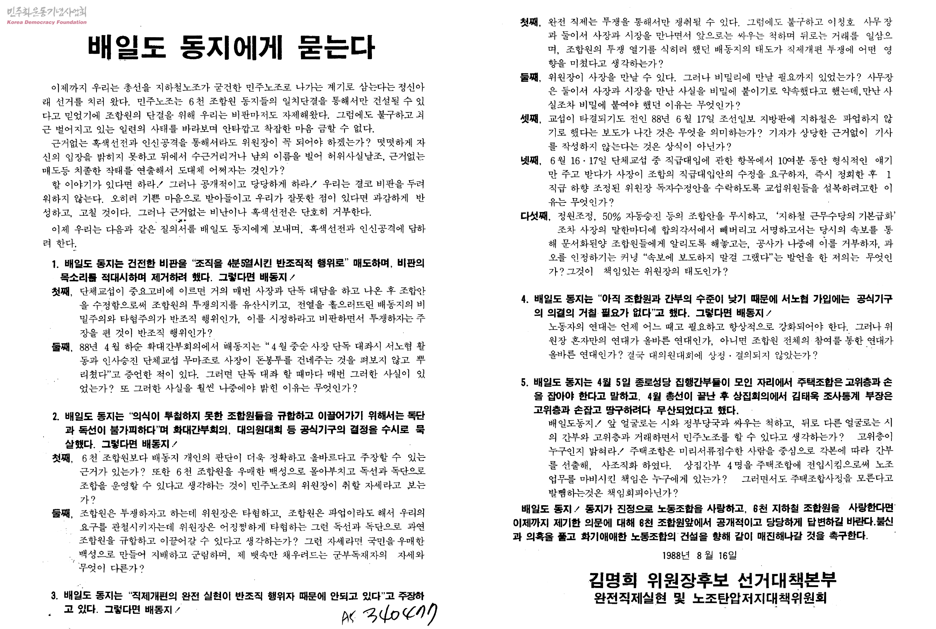 - 배일도위원장측과 김명희후보측과의 단체교섭과 도덕성에 관한 공방