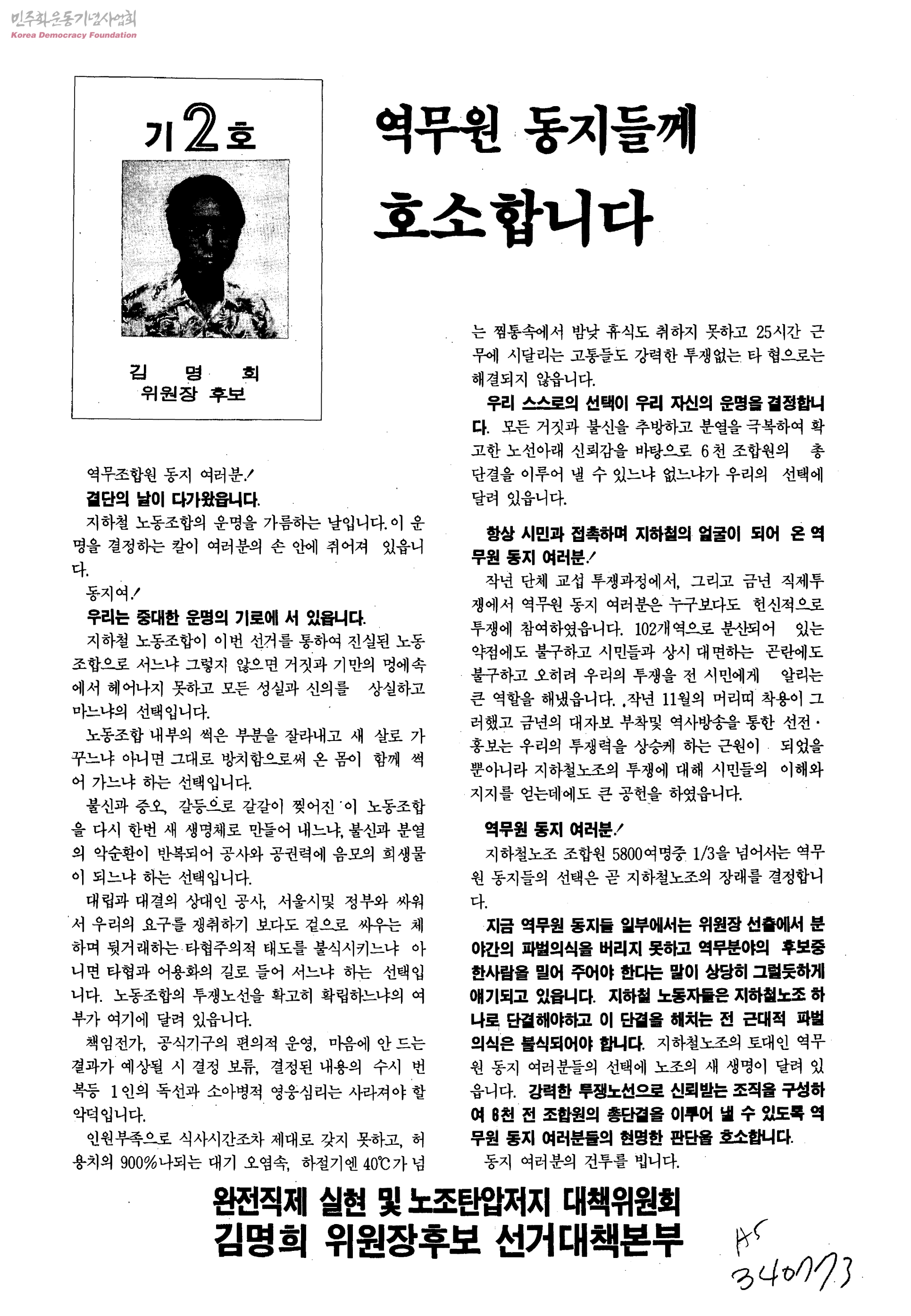 - 서울지하철완전직제실현및노조탄압저대책위원회 김명희위원장후보선거대책본부