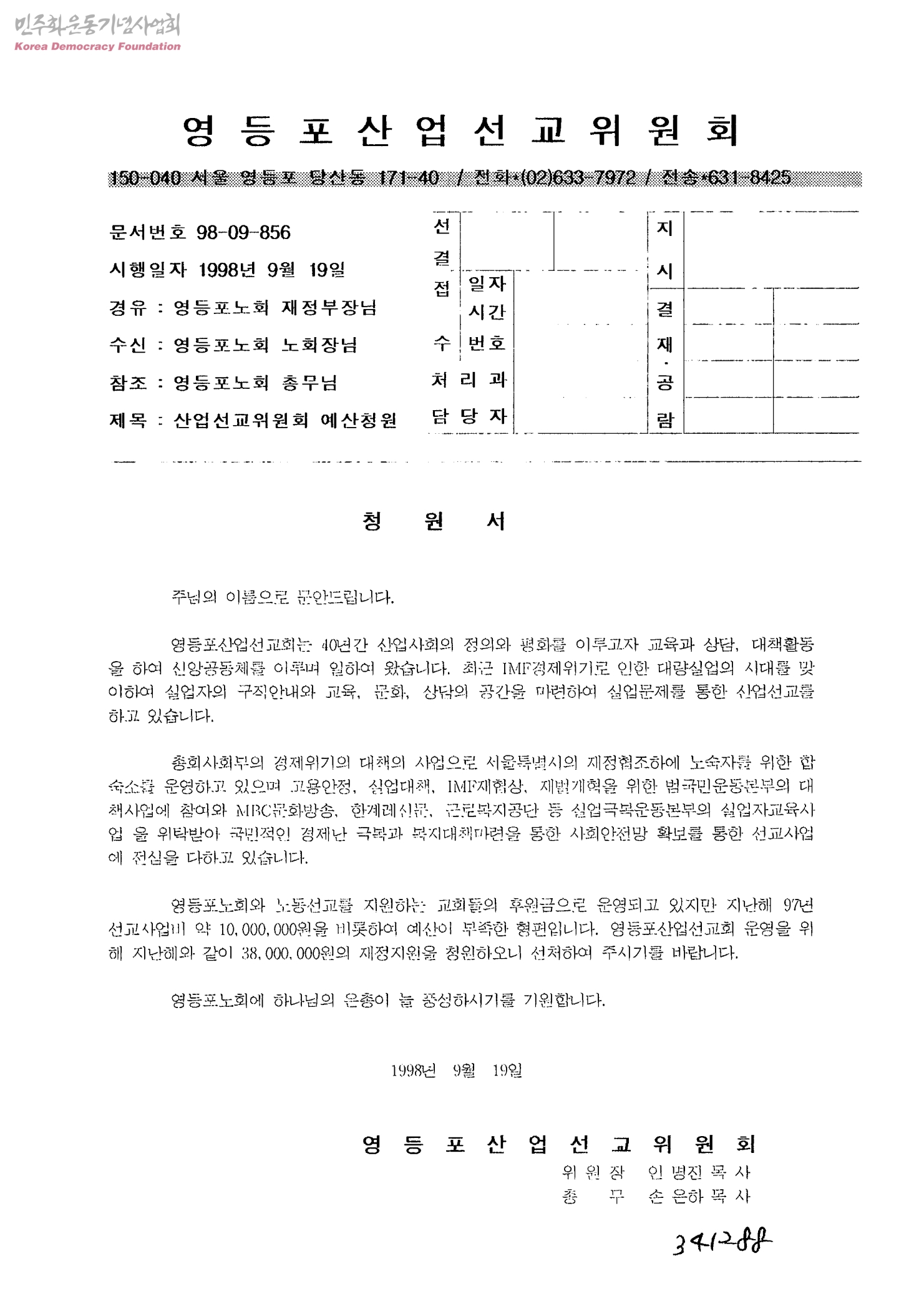 산업선교위원회 예산청원[수신:영등포노회노회장님, 발신; 영등포산업선교위원회위원장인명진목사, 총무손은하목사]