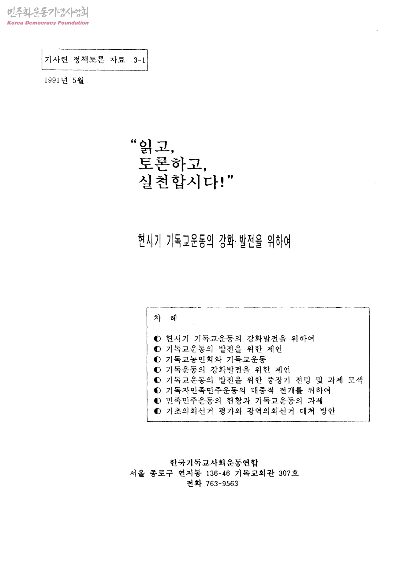 - 1)현시기 기독교운동의 강화발전 위하여,2)기독교운동의 발전을 위한제언,3)기독교농민회와 기독교운동,4)기독교운동의 강화발전을 위한제언,5)기독교운동의 발전을 위한 중장기전망 및 과제모색,6)기독자민족민주운동의 대중적 전개를 위하여,7)민족민주운동의 현황과 기독교운동의 과제,8)기초의회선거 평가와 광역의회선거 대처방안