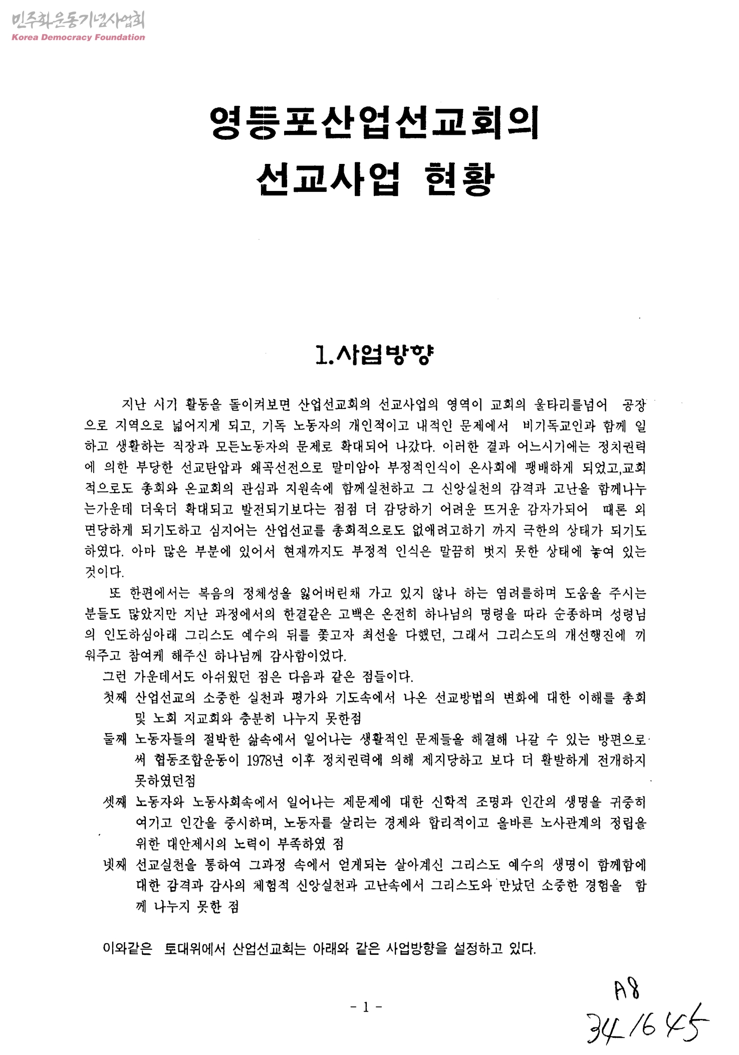 영등포산업선교회의 선교사업 현황