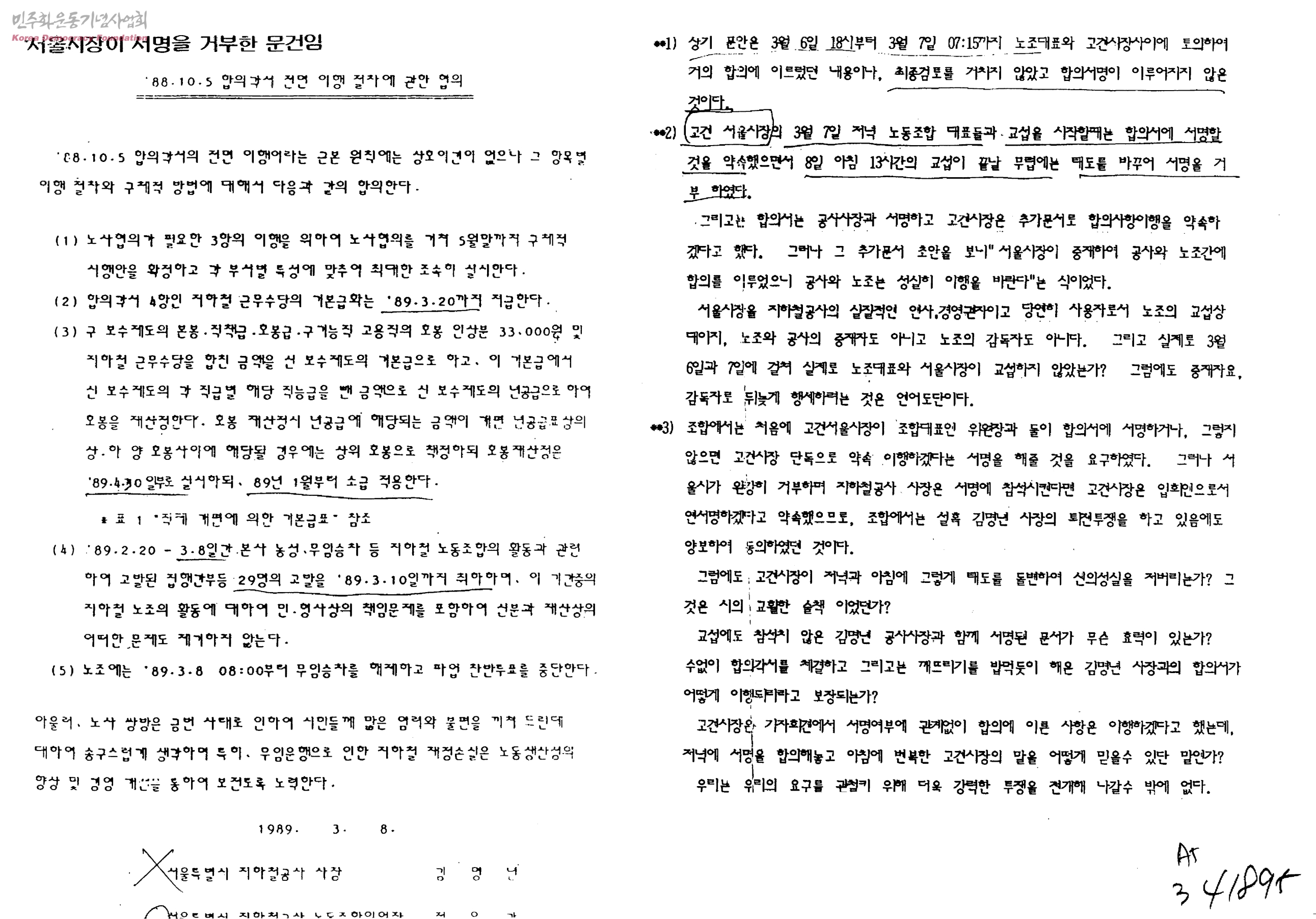 서울시장이 서명을 거부한 문건임-88.10.5 합의각서 전면 이행절차에 관한 협의