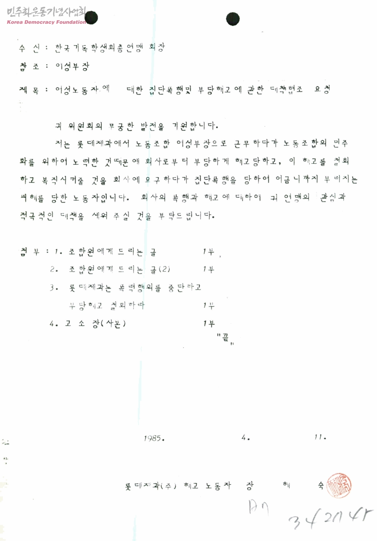 여성노동자에 대한 집단폭행 및 부당해고에 관한 대책협조 요청- 한국기독학생회총년맹회장에게]