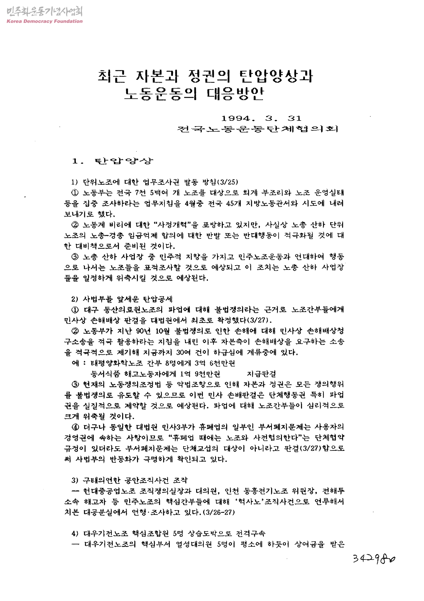 최근 자본과 정권의 탄압양상과 노동운동의 대응방안