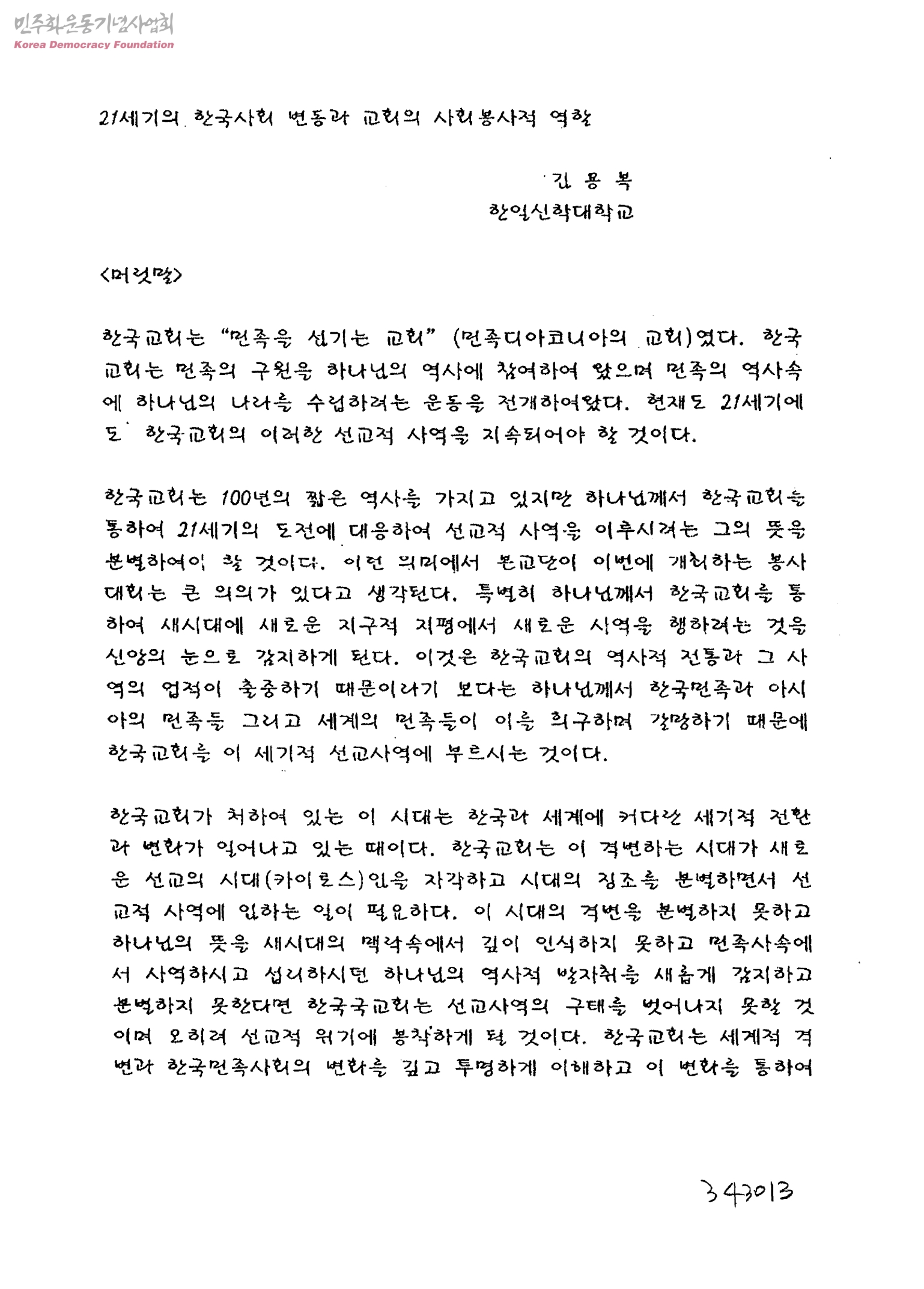 21세기의 한국사회 변동과 교회의 사회봉사적 역할