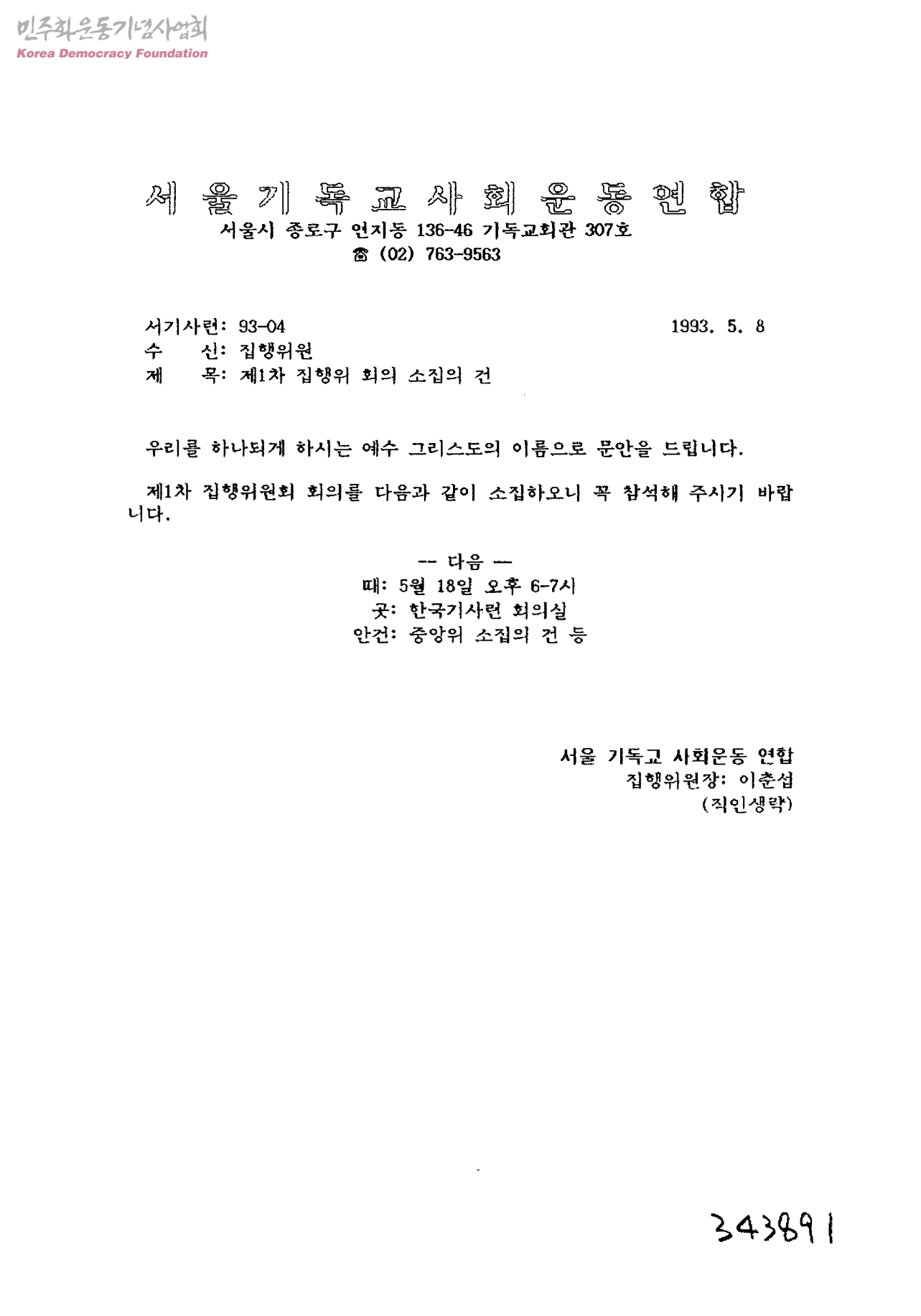 제1차 집행위 회의 소집의 건[수신:집행위원, 발신:서울기독교사회운동연합 집행위원장 이춘섭]