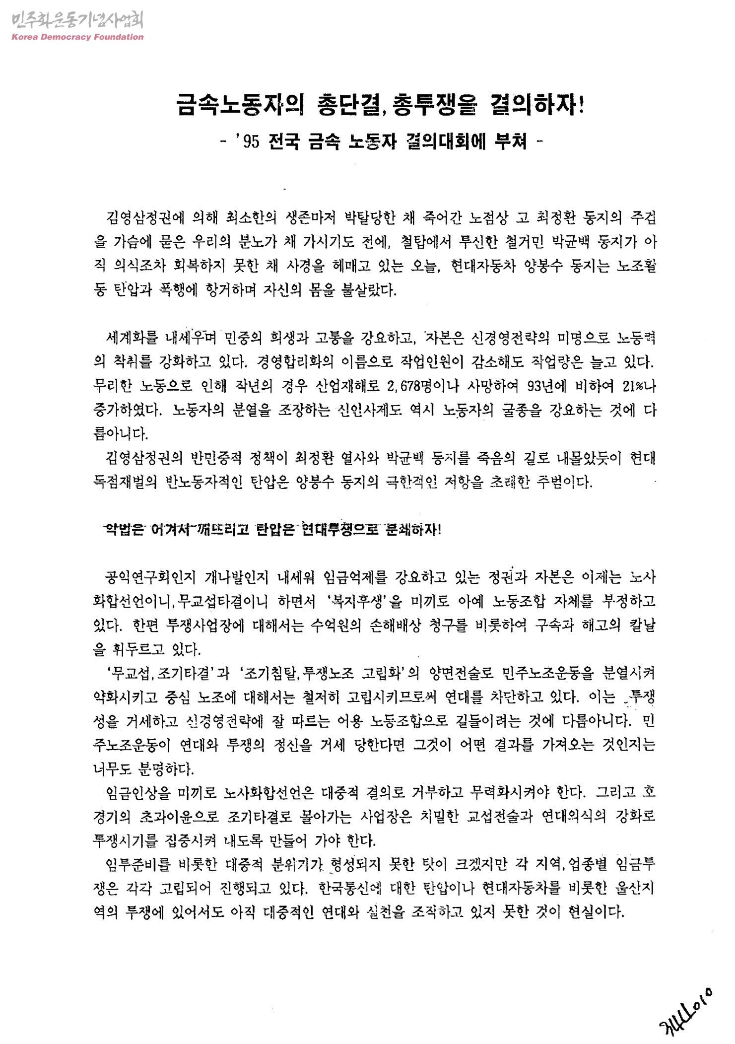 금속노동자의 총단결.총투쟁을 결의하자-'95 전국 금속 노동자 결의대회에 부쳐
