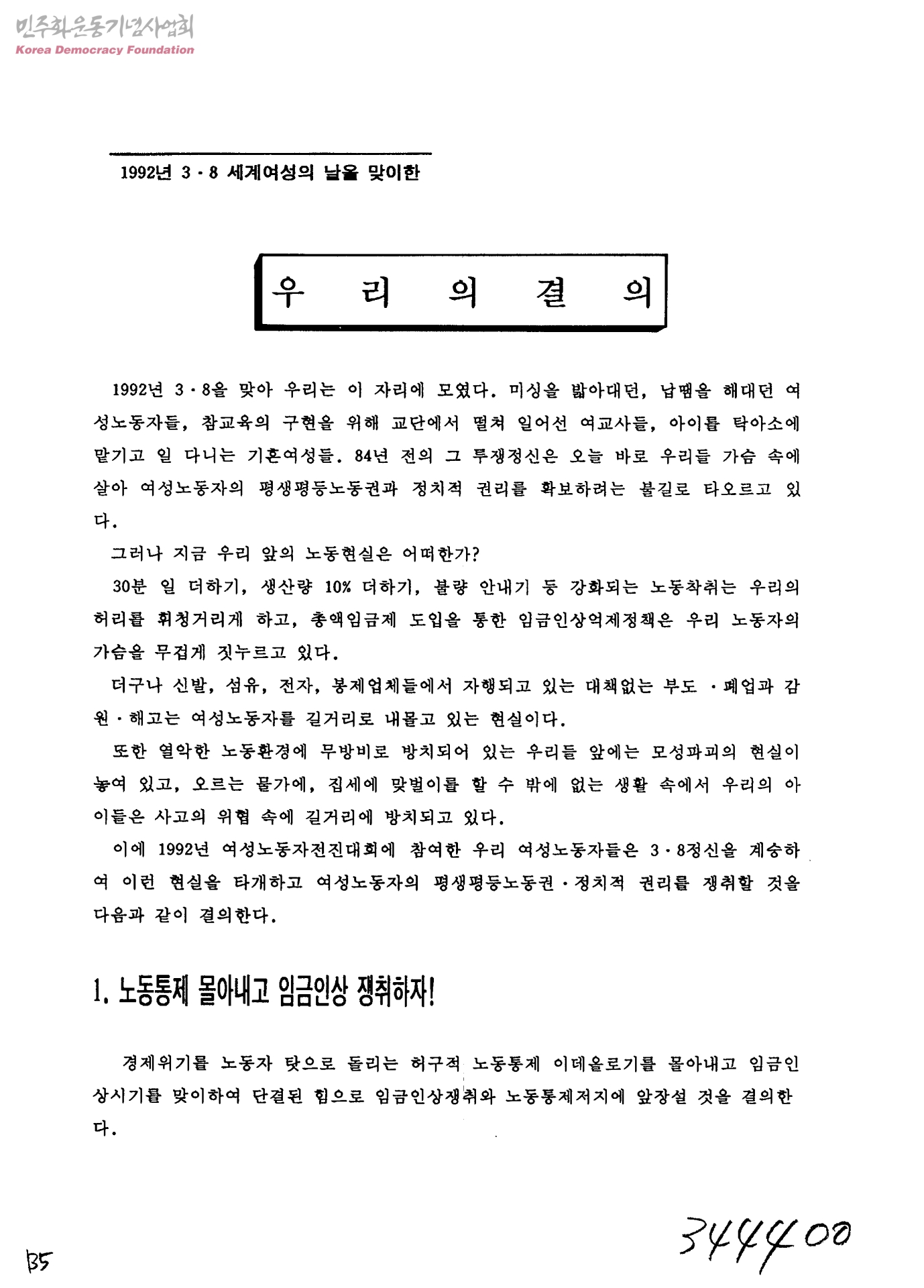 우리의결의-1992년 3.8 세계여성의 날을 맞이한