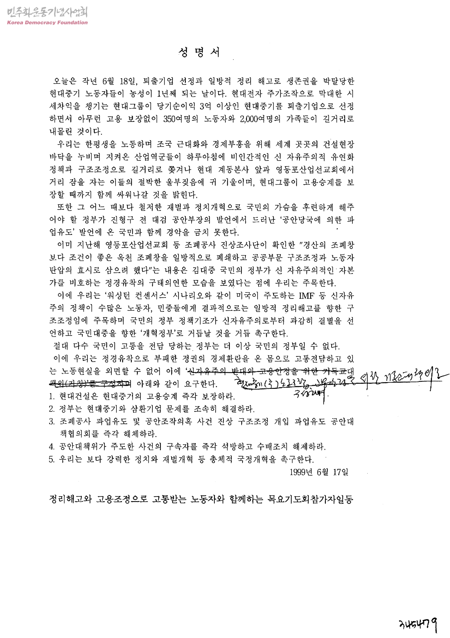 - 정리해고와고용조정으로고통받는노동자와함께하는목요기도회참가자일동