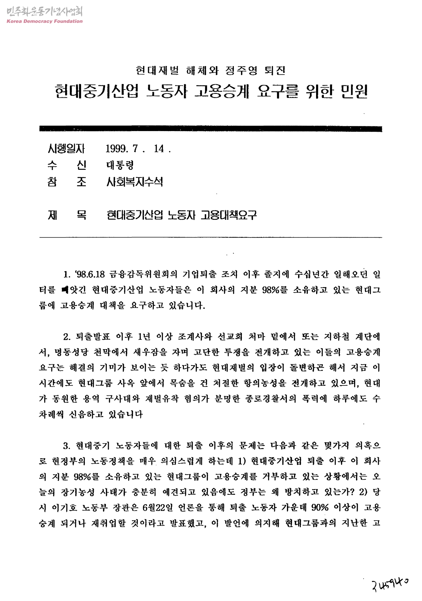 - 현대재벌해체와정주영퇴진현대중기산업노동자고용승계를요구하는시민