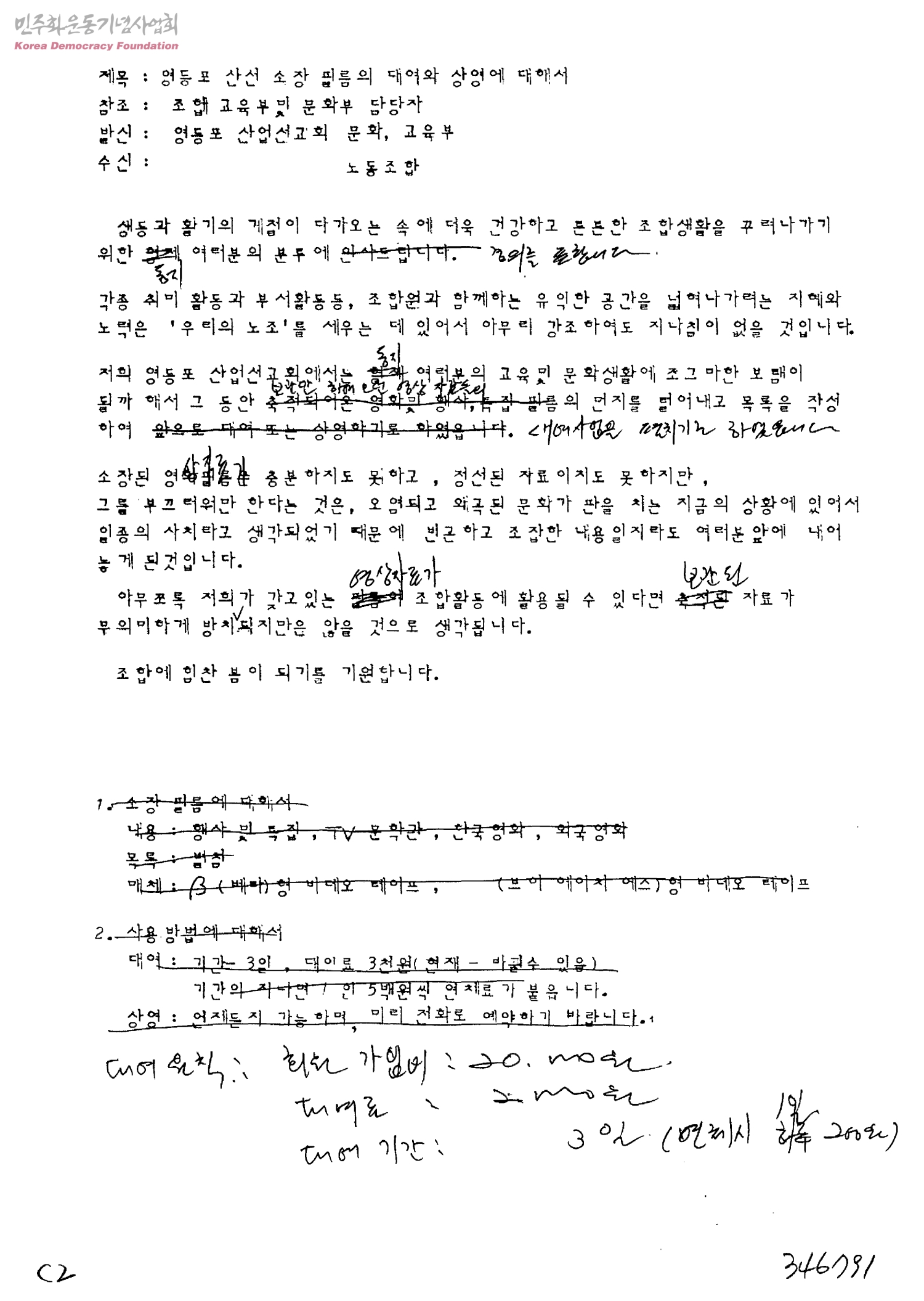 영등포산선 소장 필름의 대여와 상영에 대해서