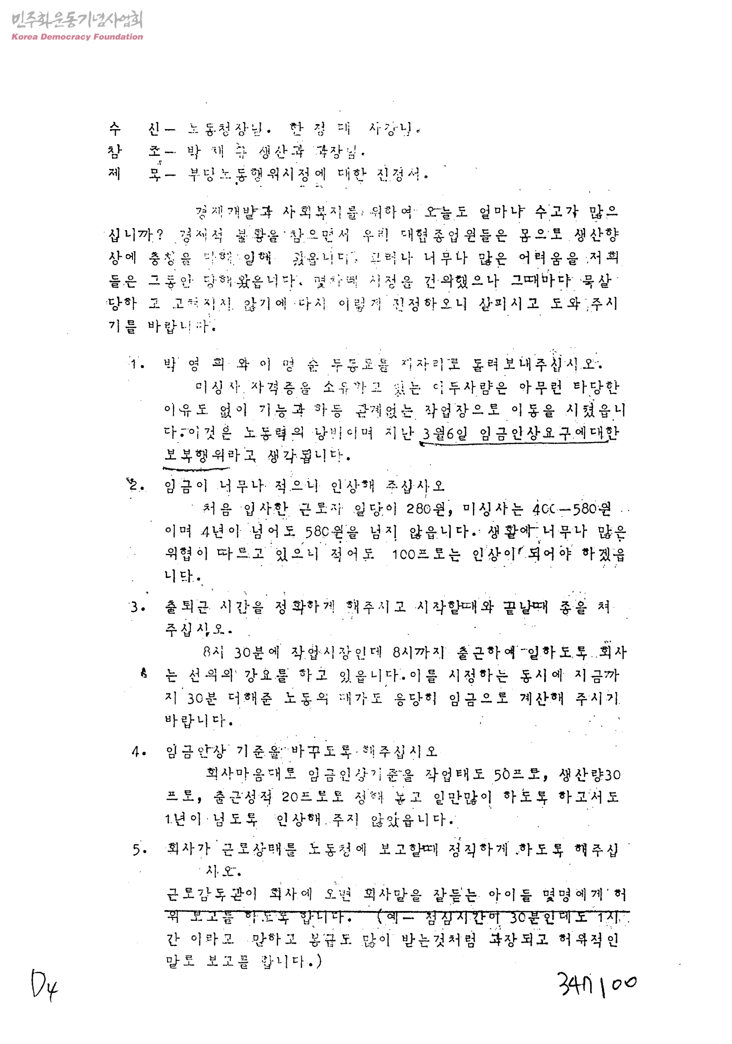 부당노동행위시정에 대한 진정서[수신:노동청장,한정대사장,박채규생산과장, 발신:주)대협 근로자일동]