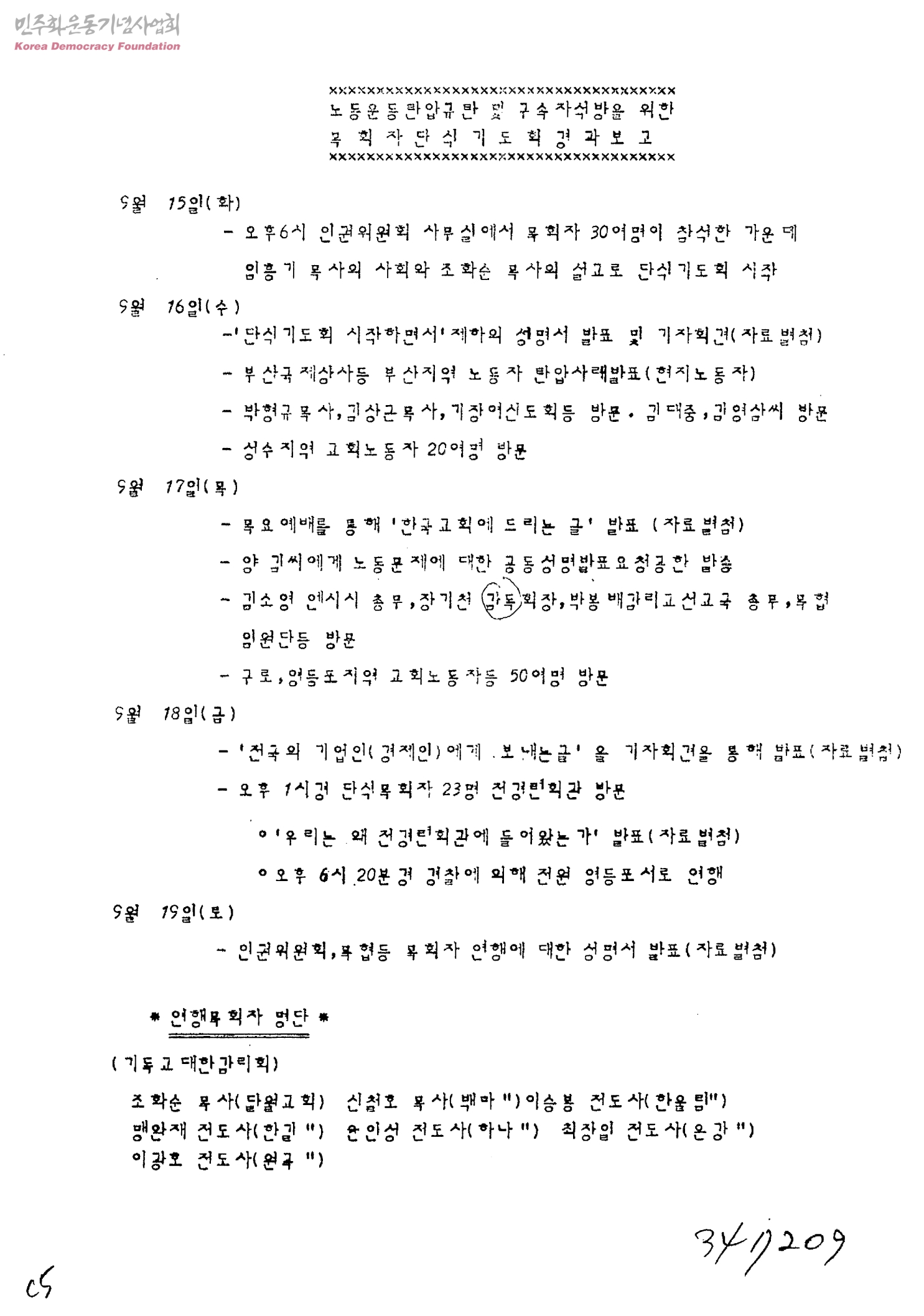 - 노동운동탄압규탄및구속자석방을위한목회자단식기도회참가자일동