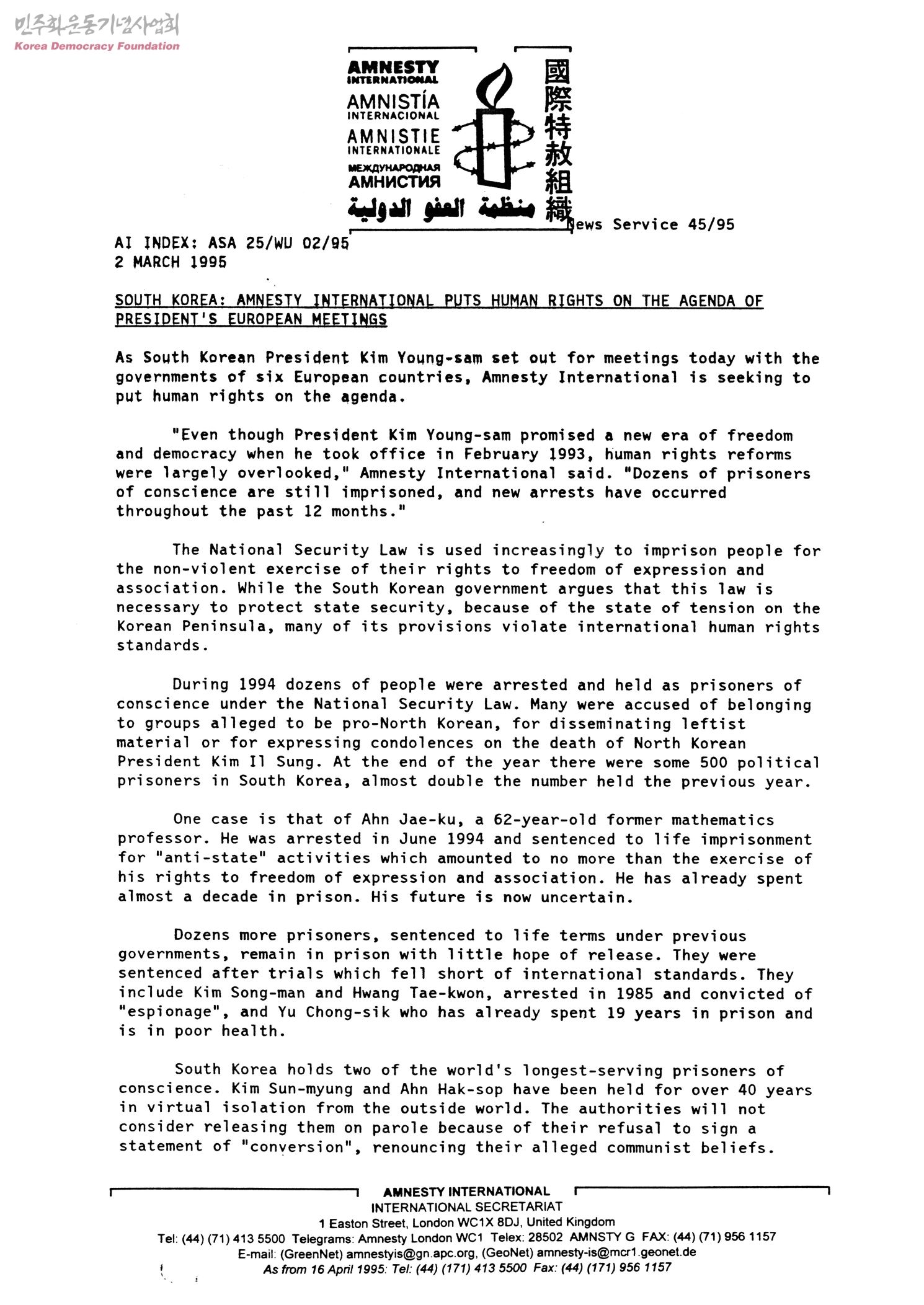 SOUTH KOREA: AMNESTY INTERNATIONAL PUTS HUMAN RIGHTS ONT HE AGENDA OF PRESIDENT'S EUROPEAN MEETINGS