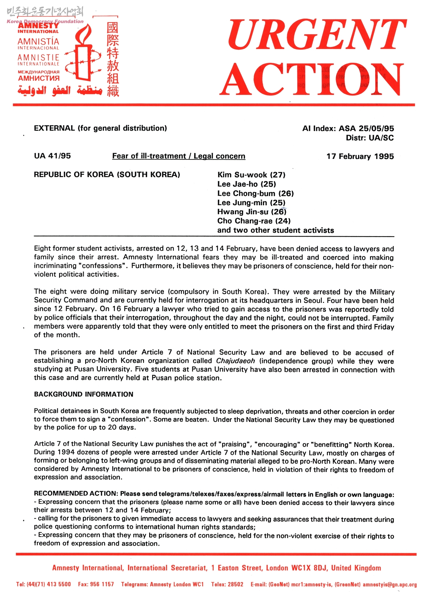 〈URGENT ACTION〉REPUBLIC OF KOREA(SOUTH KOREA): Kim Su-wook(27)/Lee Jae-ho(25)/Lee Chong-bum(26)/Lee Jung-min(25)/Hwang Jin-su(26)/Cho Chang-rae(24) and two other student activists