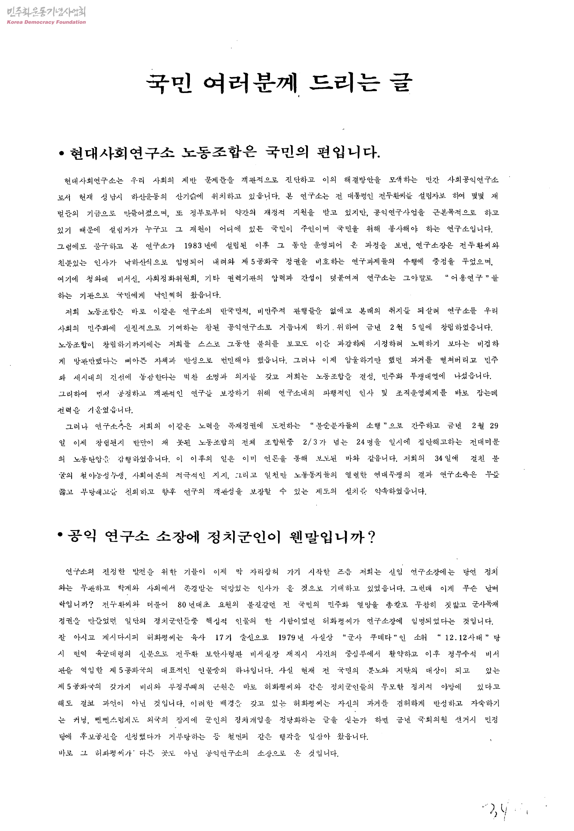 국민여러분께 드리는 글[부당해고 철회하고 허화평은 즉각 퇴진하라!!]