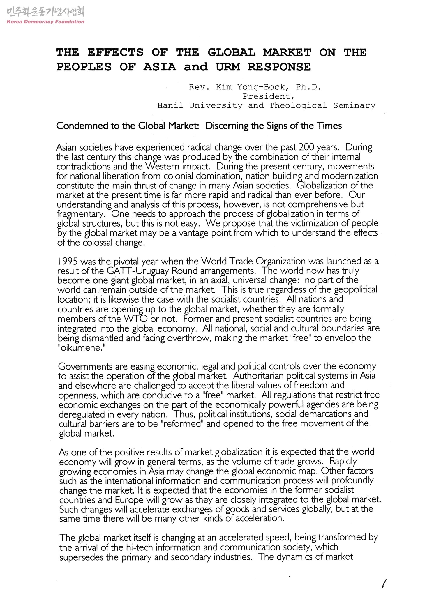 THE EFFECTS OF THE GLOBAL MARKET ON THE PEOPLES OF ASIA and URM RESPONSE