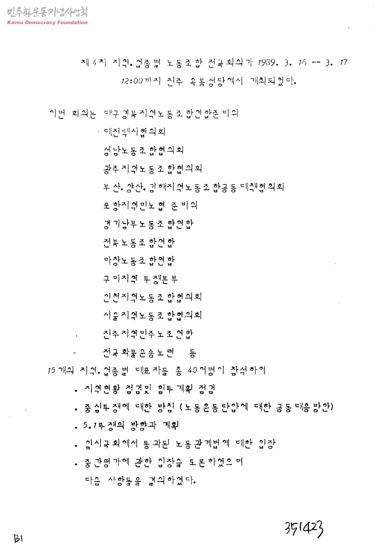 제4차 지역.업종별 노동조합 전국회의가 1989.3.16-3.17 12:00까지 진주 옥봉성당에서 개최되었다