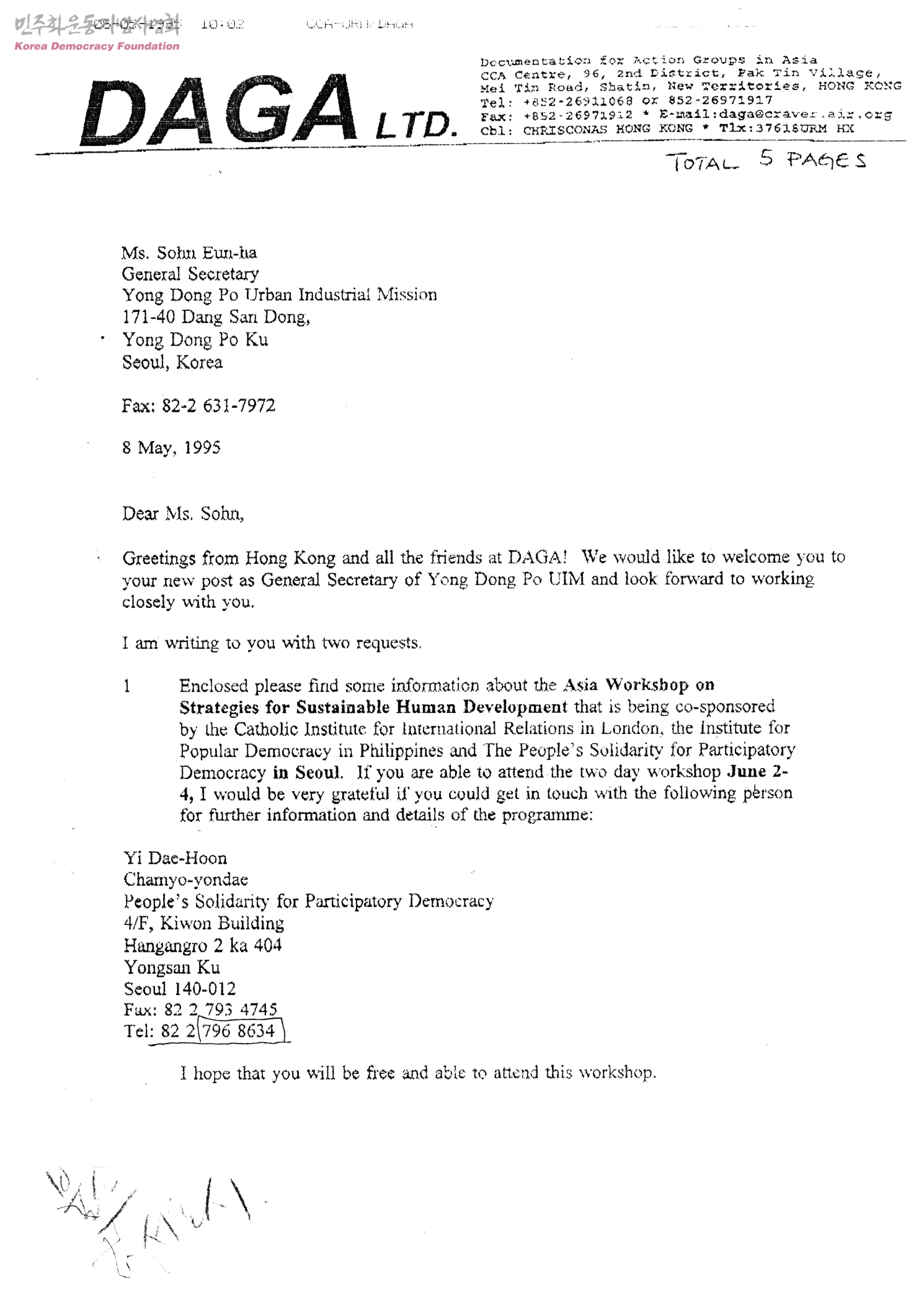 DAGA측이 Asia Workshop on Strategies for Sutainable Human Development 관련되서 영등포도시산업선교회측에 보낸는 서신문]