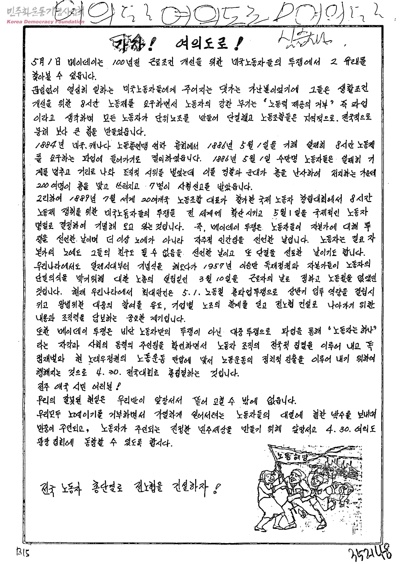 - 생산자 및 기증자가 ‘박용수’인 사진의 사용은 구매신청을 클릭하여 직접 사진 구매 신청을 하실 수 있습니다. 생산자 및 기증자가 ‘경향신문사’인 사진의 사용은 경향신문사 담당자(02-3701-1635)를 통해 구매하실 수 있습니다. 그 외의 생산자 및 기증자는 민주화운동기념사업회 사료관 담당자( hyunchaek@kdemo.or.kr / 02-6440-8961 )에 문의바랍니다.