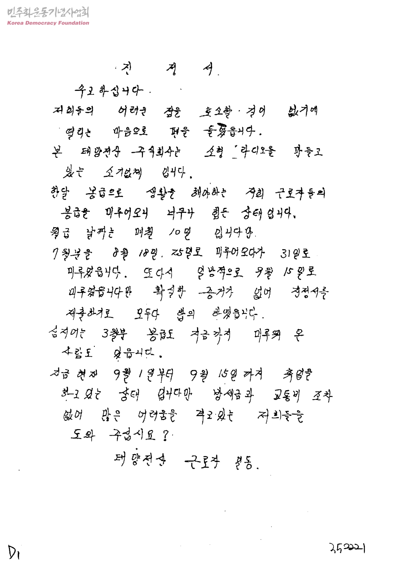 진정서[㈜태양전선의 임금 미지급에 관한 것]
