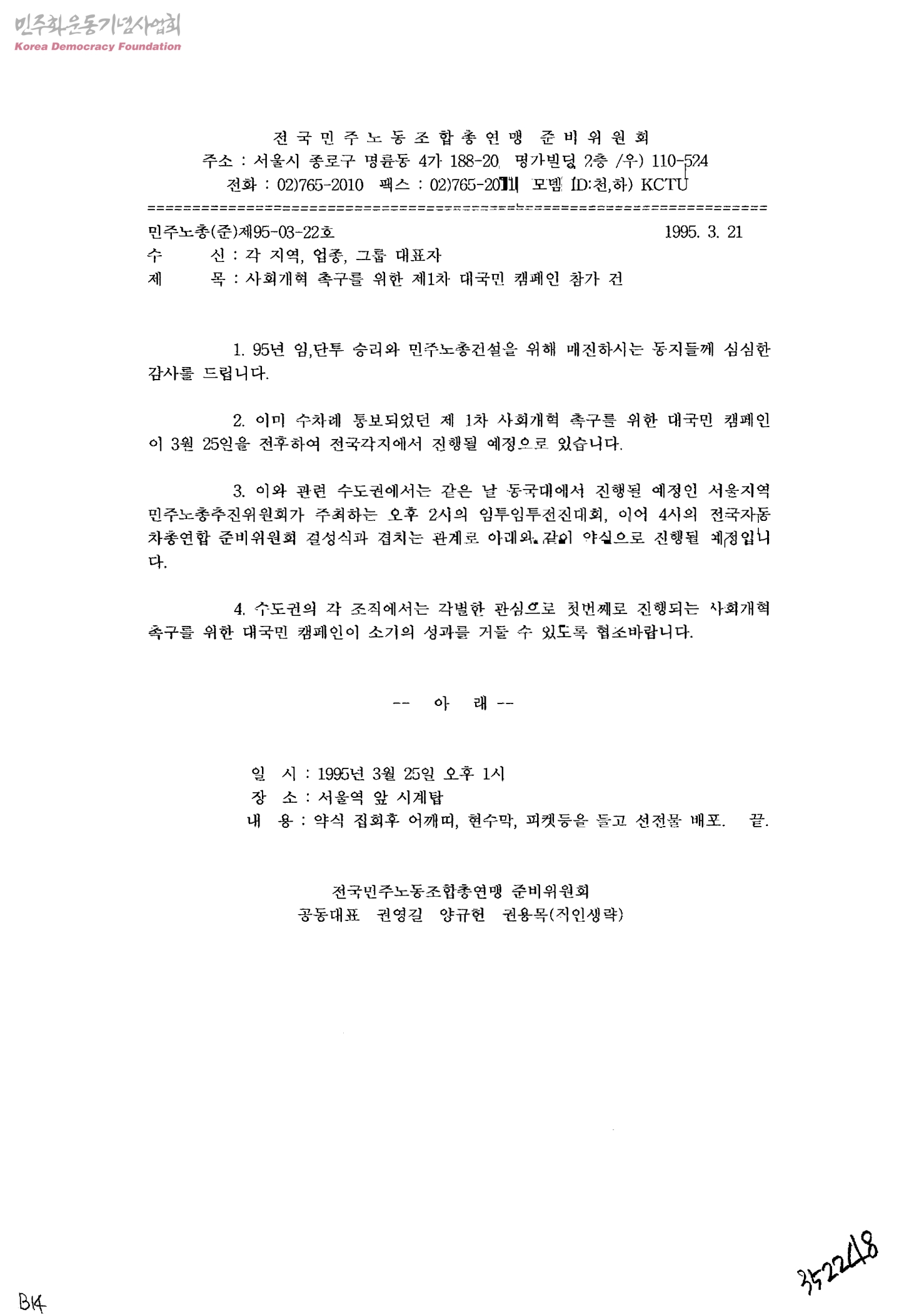 사회개혁 촉구를 위한 제1차 대국민 캠페인 참가 건[수신:각 지역 업종, 그룹 대표자, 발신:전국민주노동조합총연맹준비위원회]