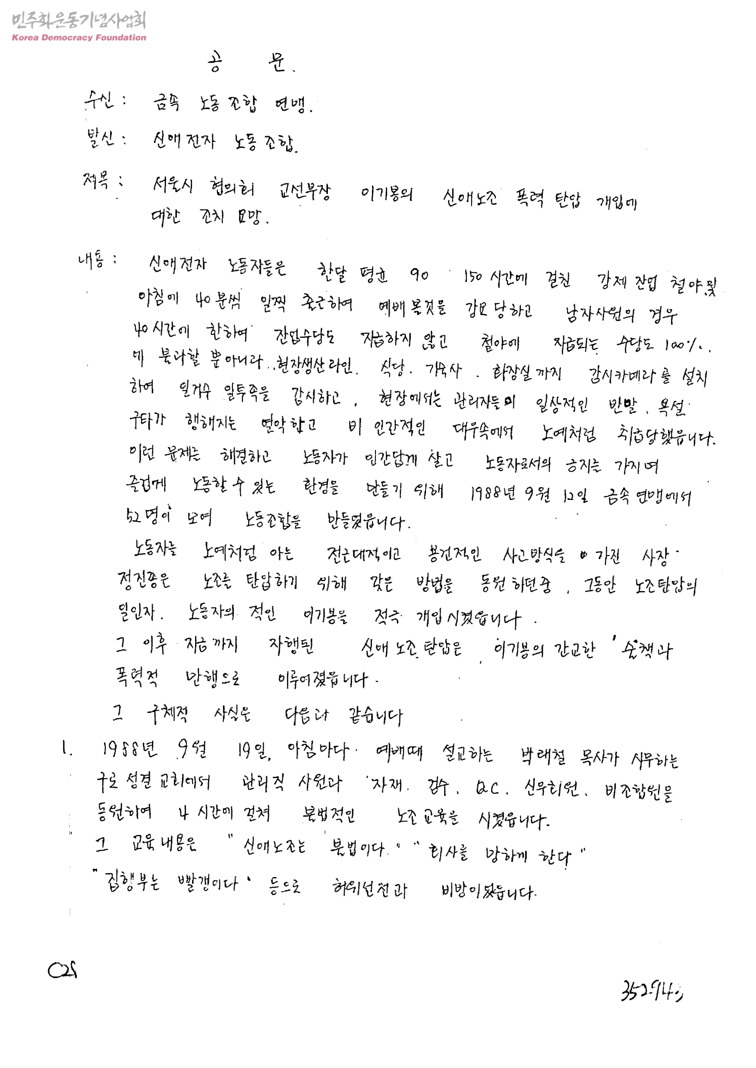 서울시협의회 교선부장 이기봉의 신애노조 폭력 탄압 개입에 대한 조치 요망[수신:금속노동조합연맹, 발신:신애전자노동조합 위원장 박종숙]
