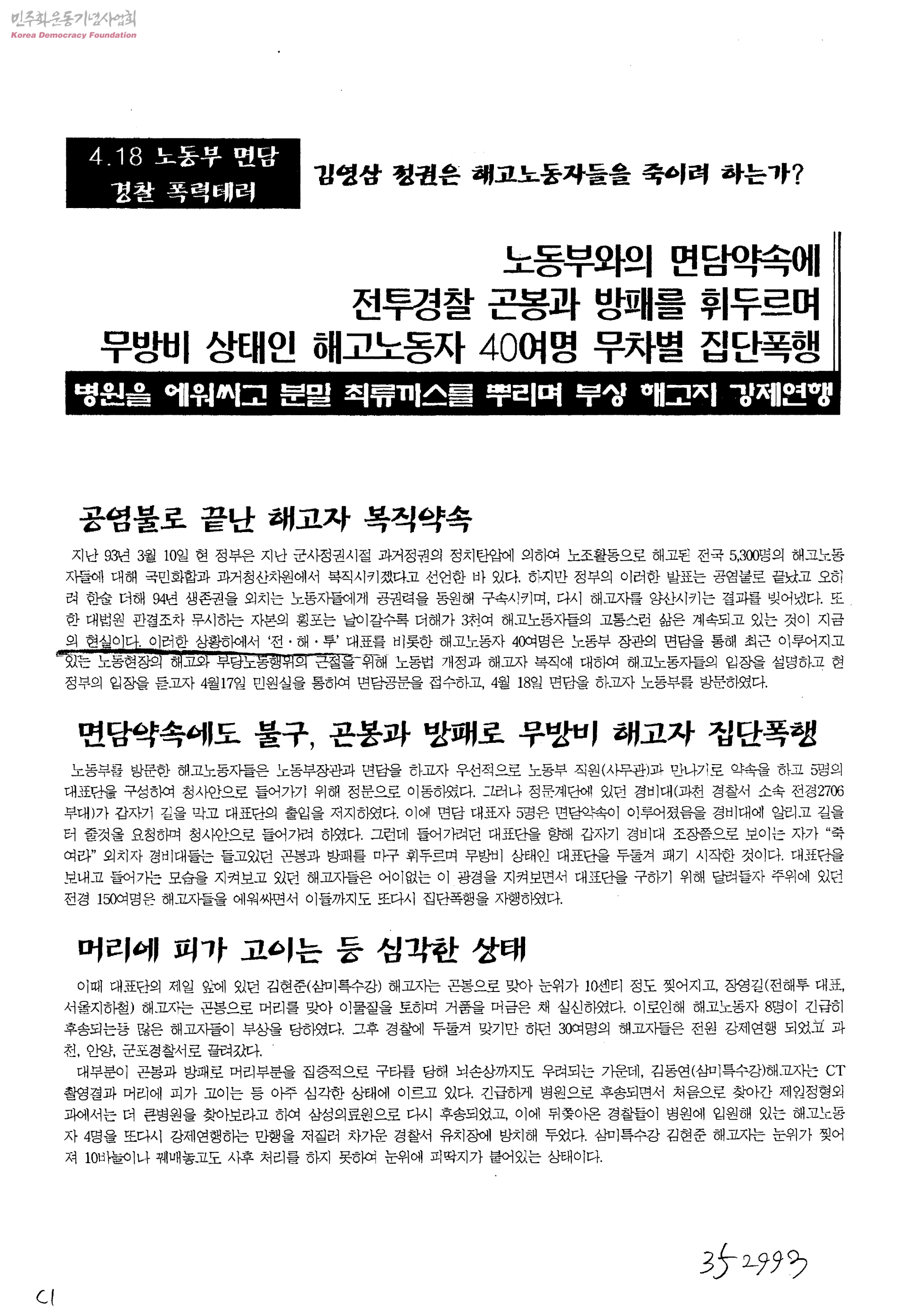 노동부와의 면담약속에 전투경찰 곤봉과 방패를 휘두르며 무방비 상태인 해고노동자 40여명 무차별 집단폭행 관한유인물