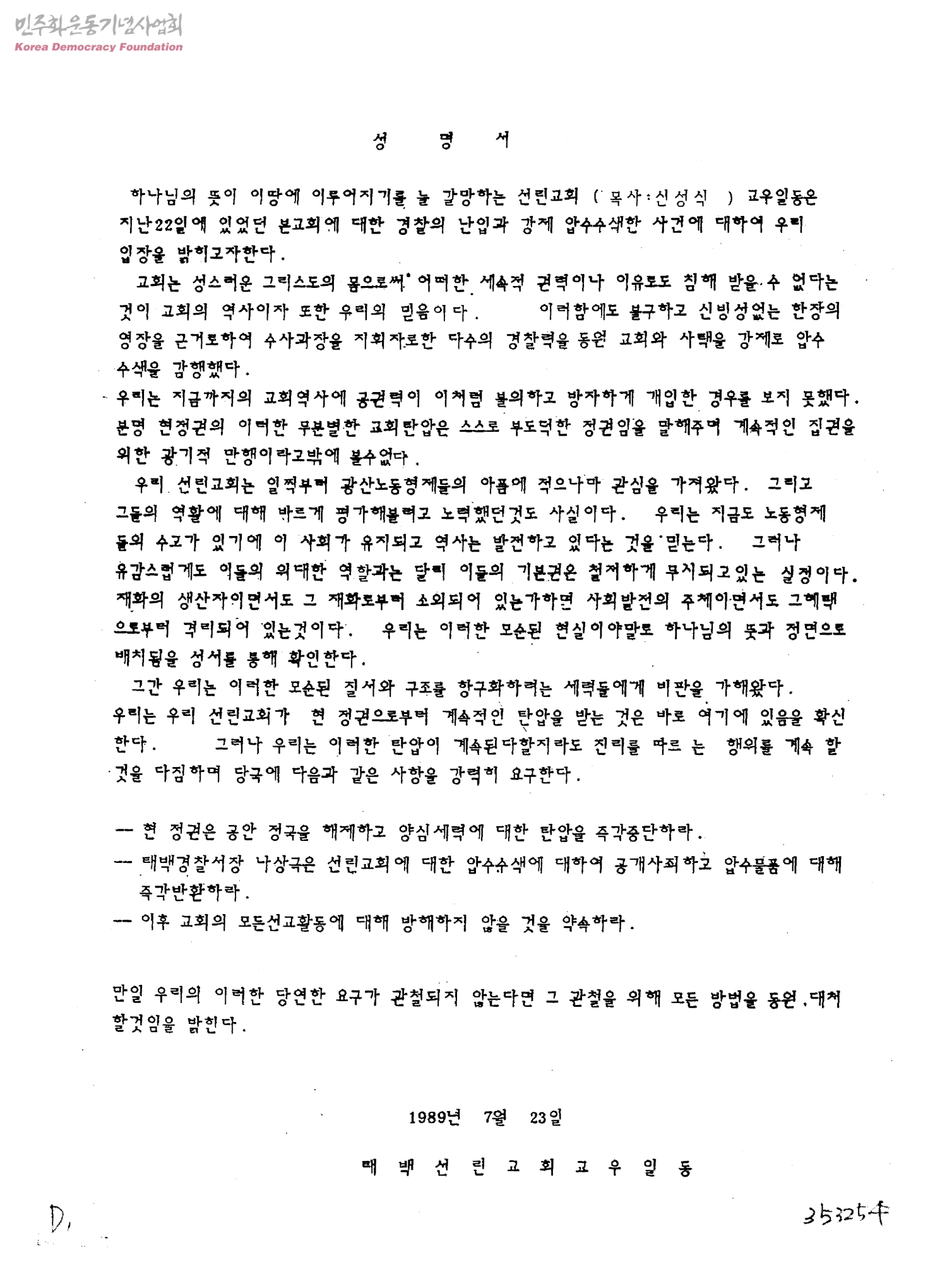 성명서[선리교회에 경찰의 난입과 강제 압수수색한 사건에 대한 입장]
