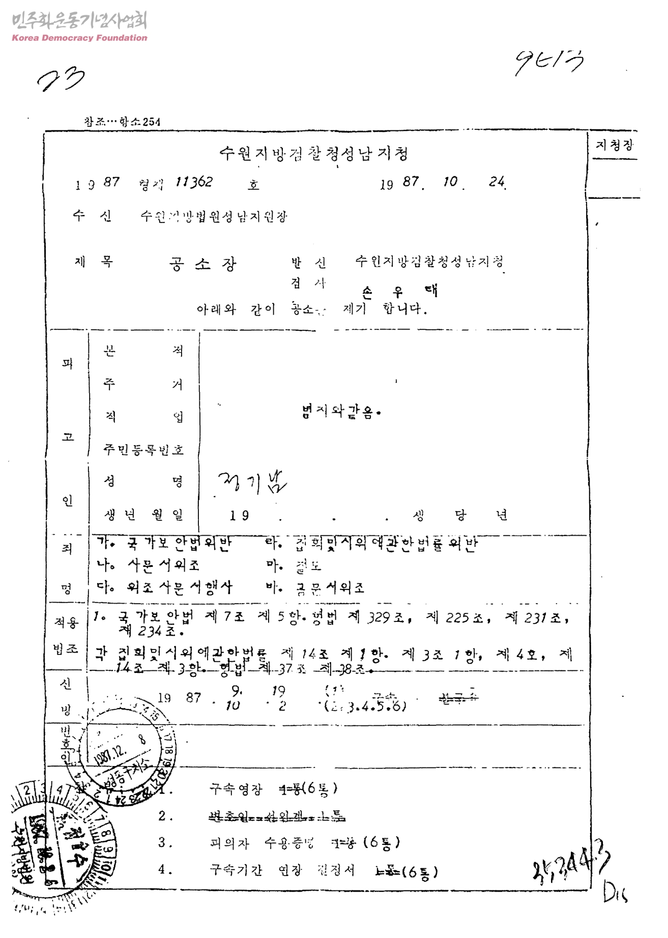 공소장[수신:수원지방법원성남지원장, 발신:수원지방검찰청성남지청 검사 손우태]